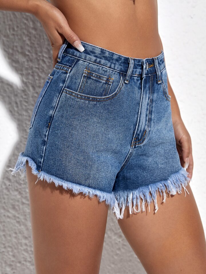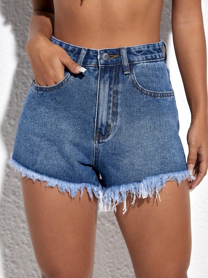 Shorts in denim vita alta con stampa farfalla orlo grezzo