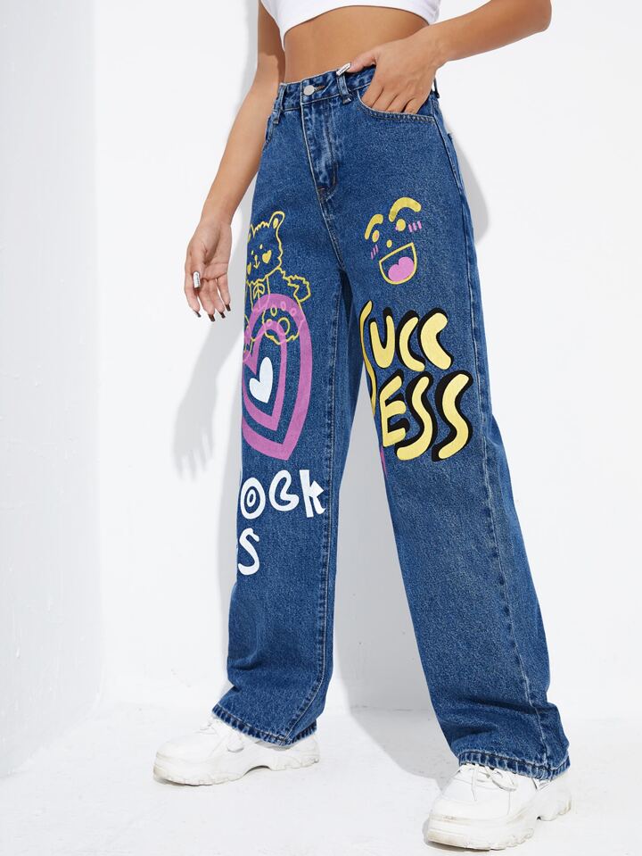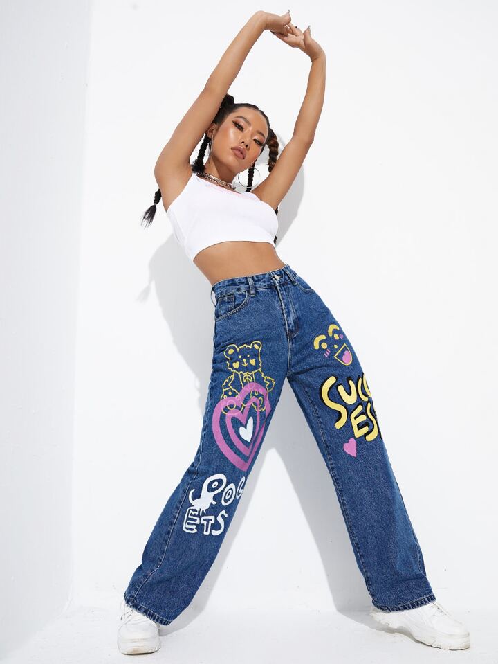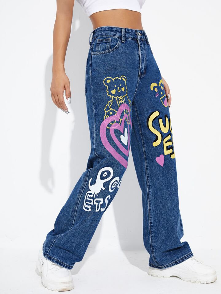 Jeans da ragazzo a vita alta con fumetto e lettera grafica