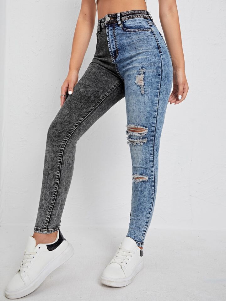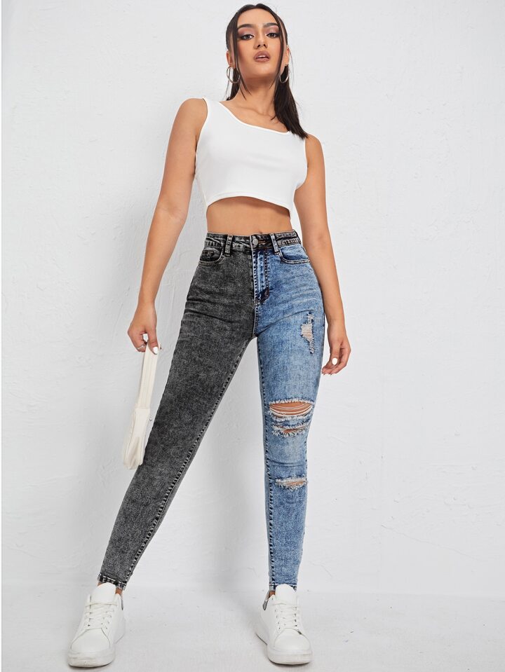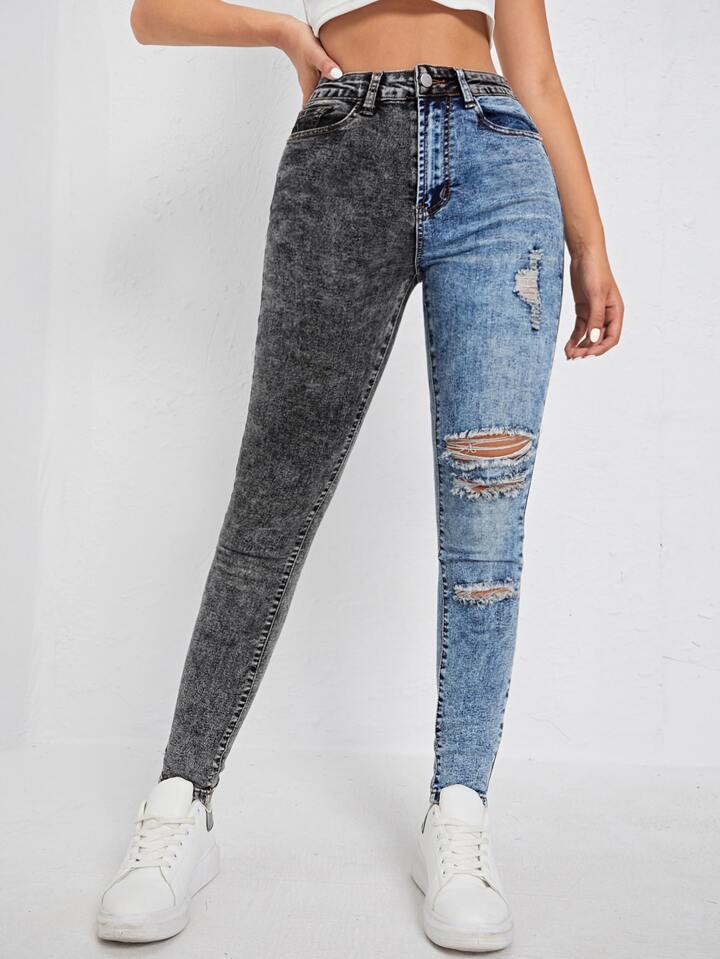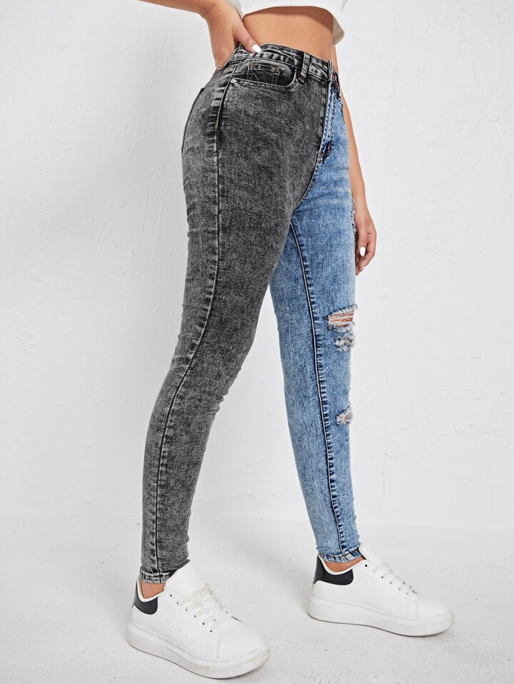 Jeans skinny bicolore con strappati e vita alta