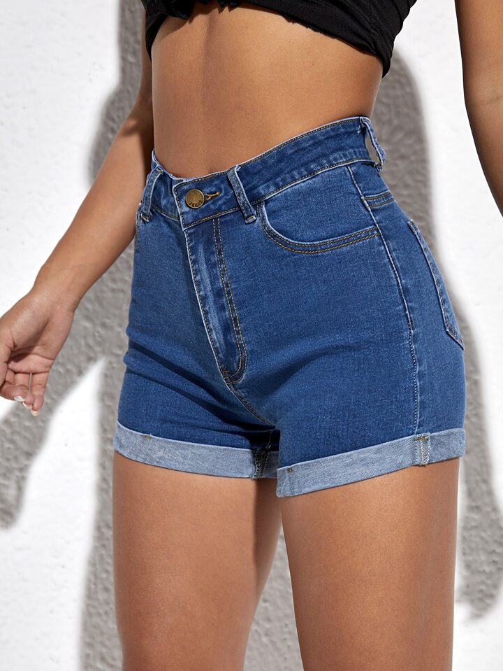 Shorts in denim vita alta con orlo arrotolato