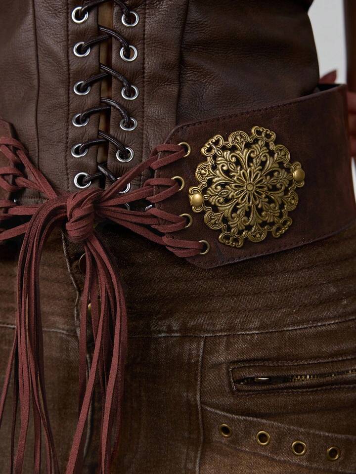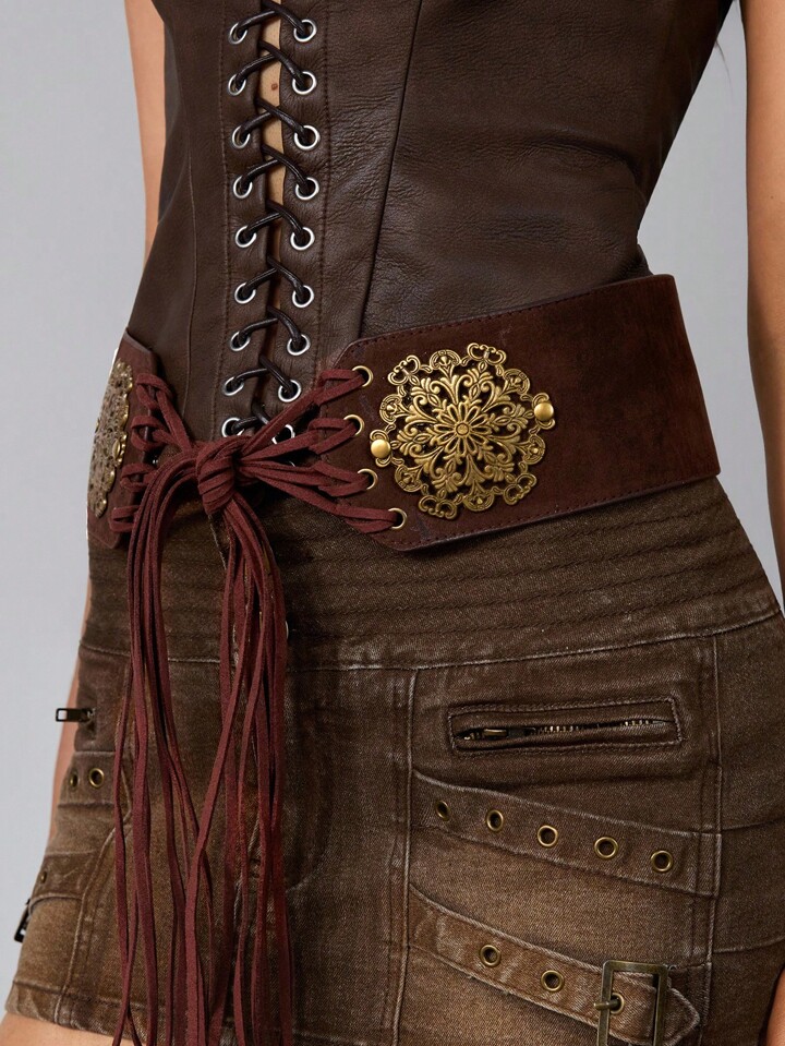 Hippie 1 pezzo Cintura da donna con accento floreale traforato decorata in finta pelliccia con nappine