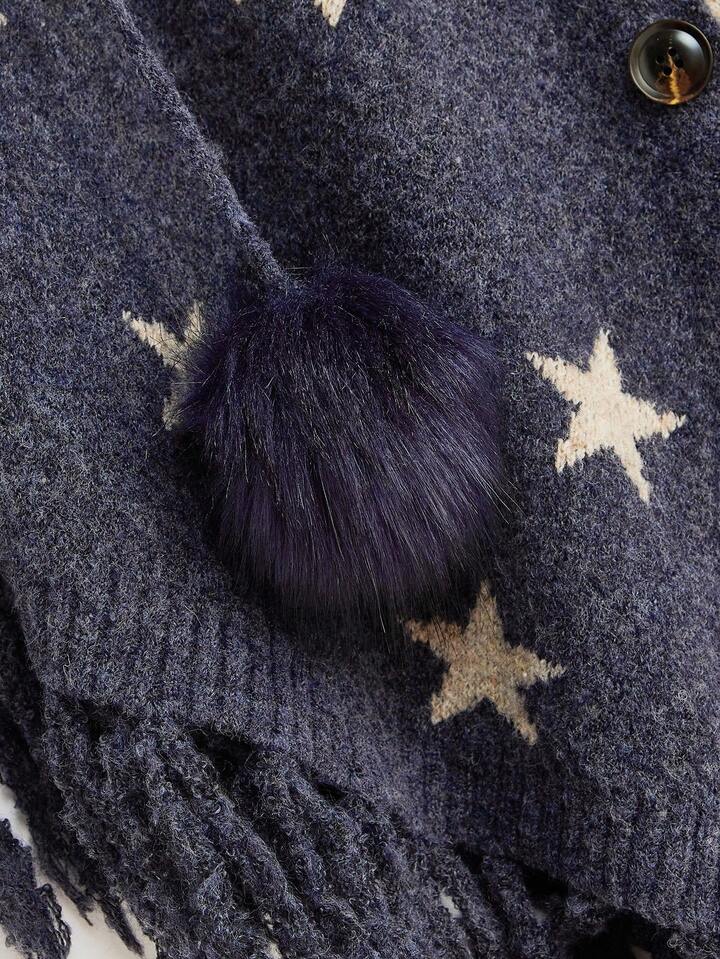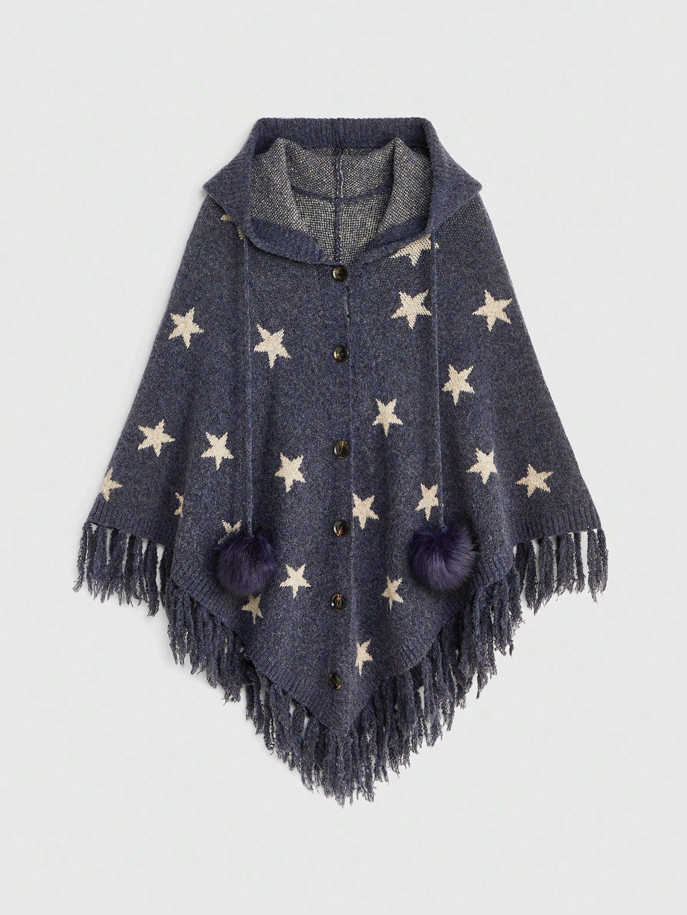 Cardigan con cappuccio da donna in stile boho hippie e strega, con motivo a stelle jacquard, maniche a pipistrello e frange all'orlo