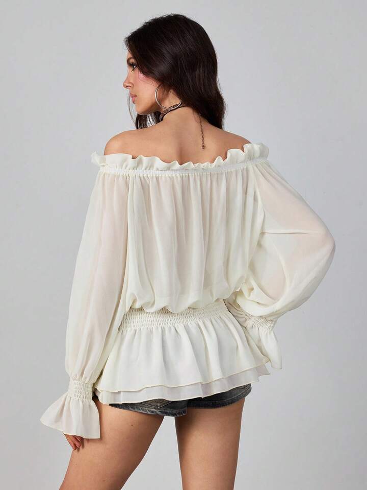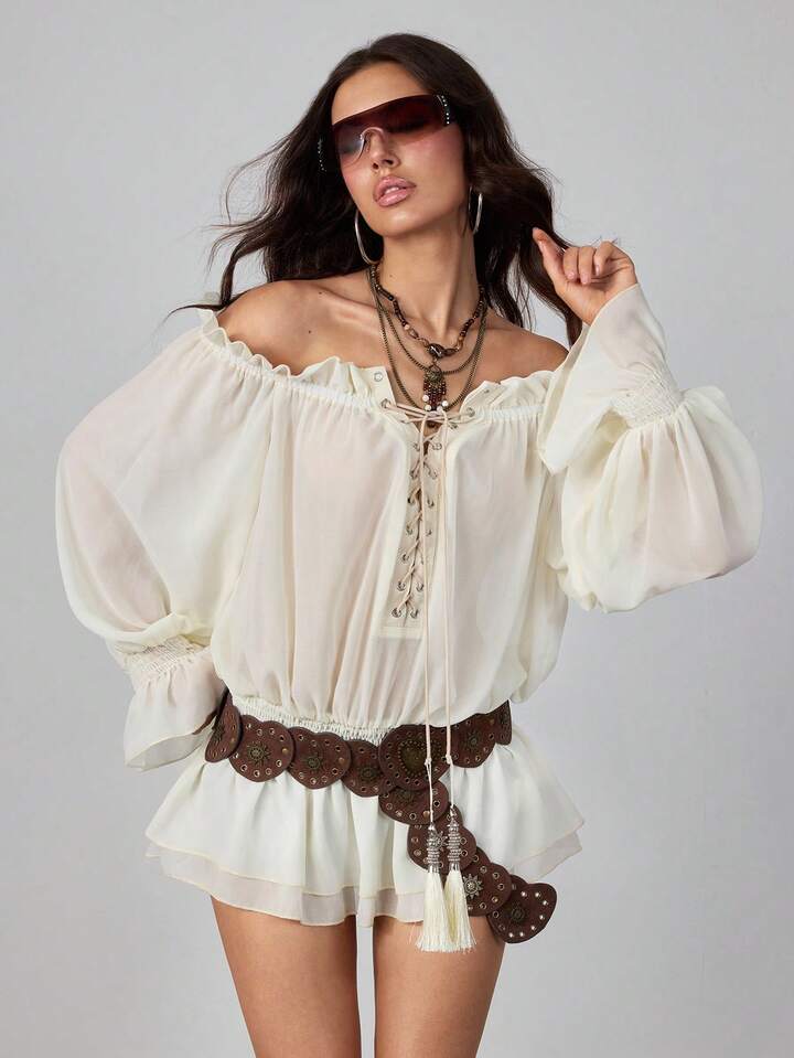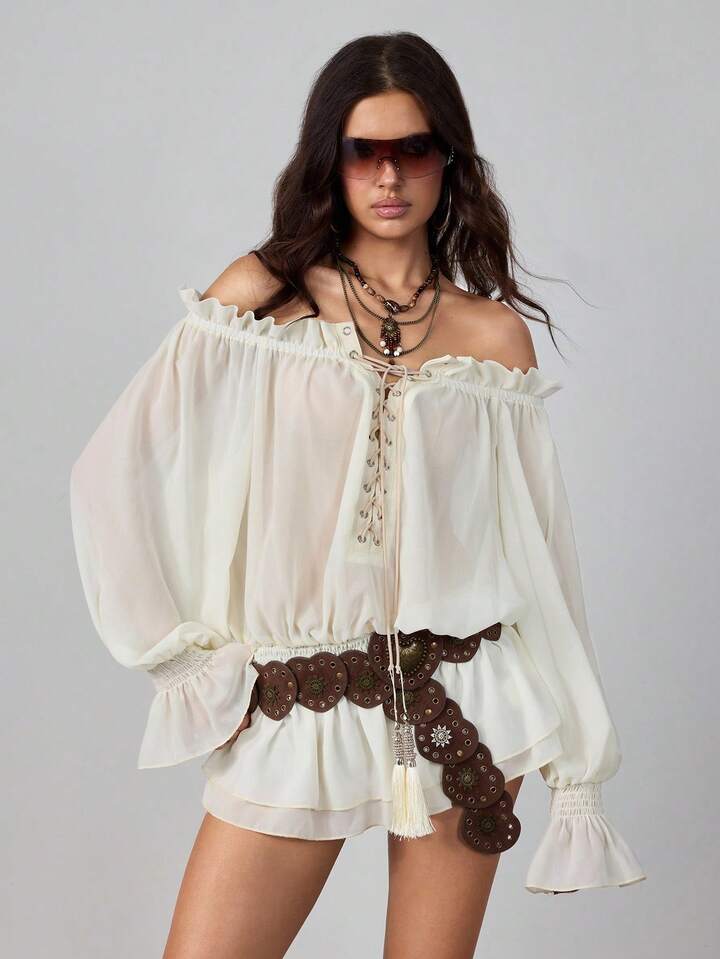 Camicia da donna stile hippie boho con spalle scoperte, maniche a lanterna e pizzo traforato con allacciatura