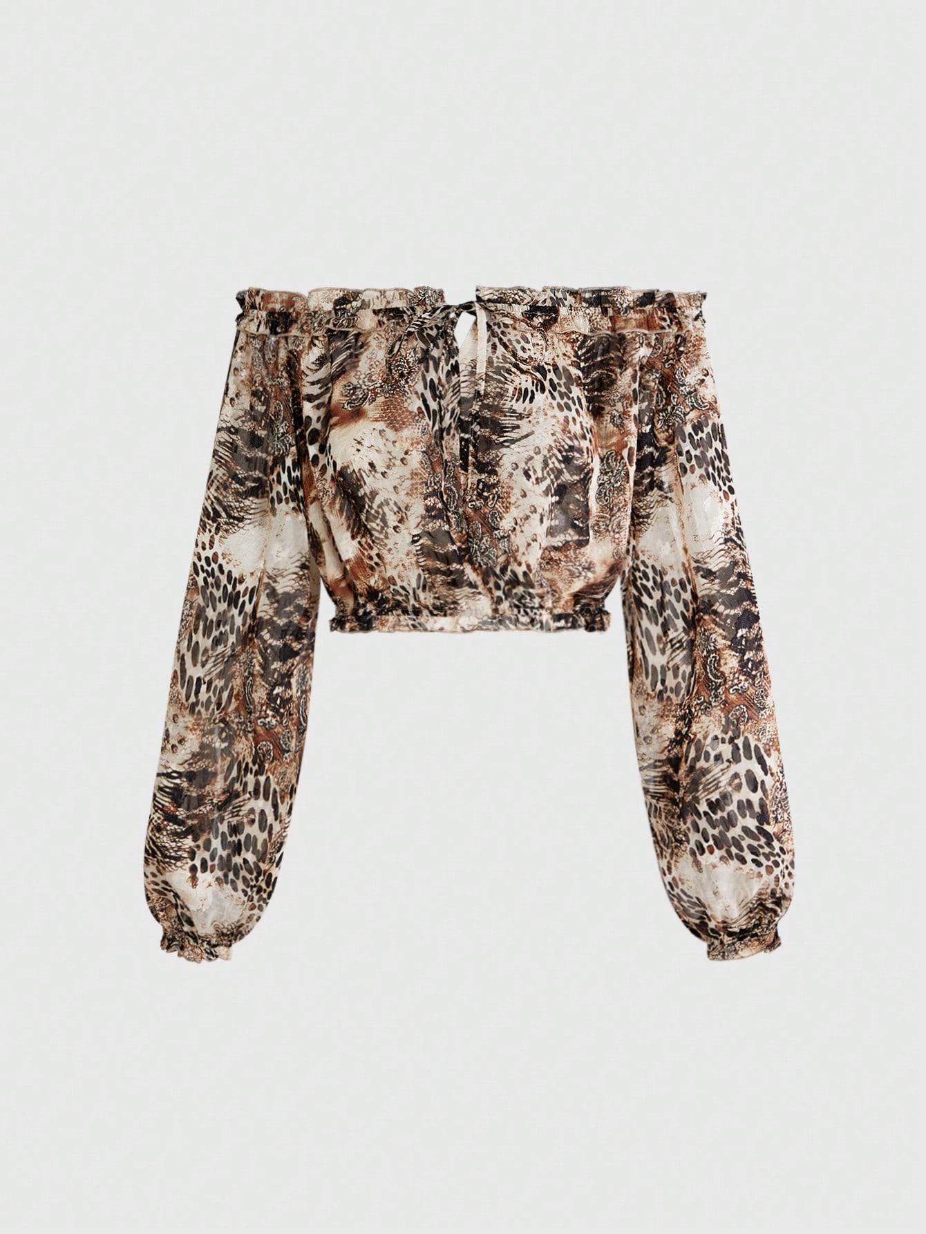 Hippie Blusa elegante e sexy da donna con maniche a petalo in chiffon trasparente, stampa leopardata e scollo spalle scoperte