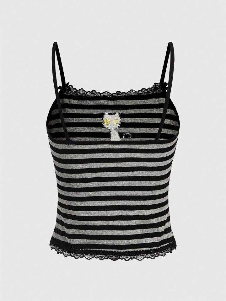 Hippie Canottiera A Righe Con Top Magico Di Gatto Nero Ricamato