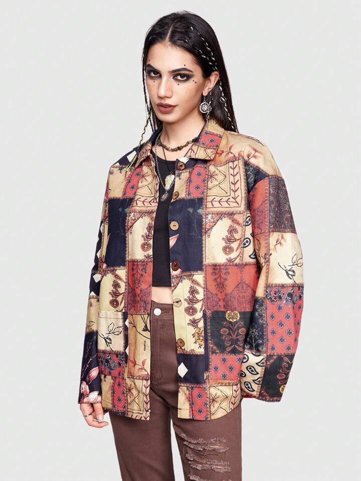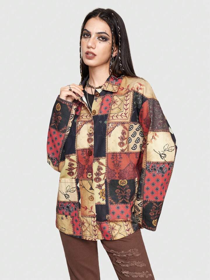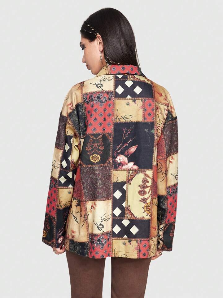 Hippie Cappotto stampa patchwork spalle cadenti con bottone frontale