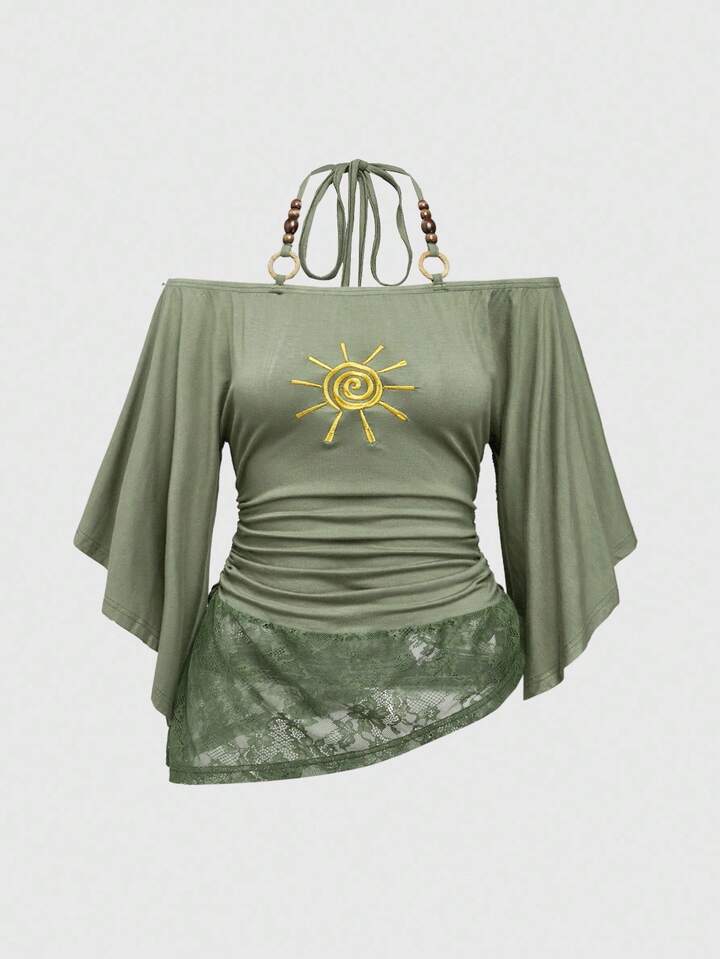 Hippie Maglietta da donna oversize vintage con scollo a spalle scoperte, decorazione in perle di legno e maniche a pipistrello