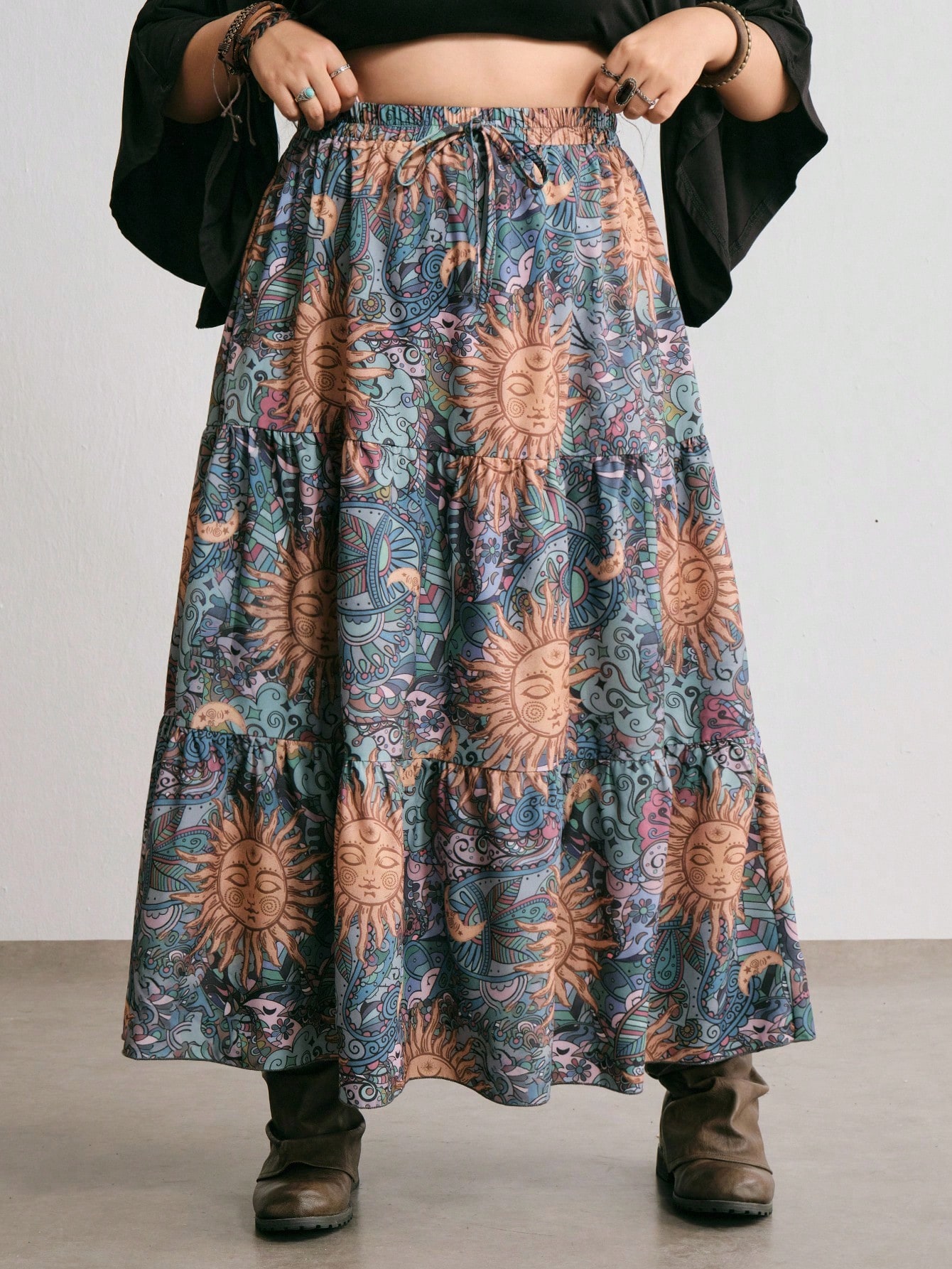 Hippie Gonna casual con arricciatura sul fondo, con stampa di soli, lune e stelle e cintura annodata, per taglie comode