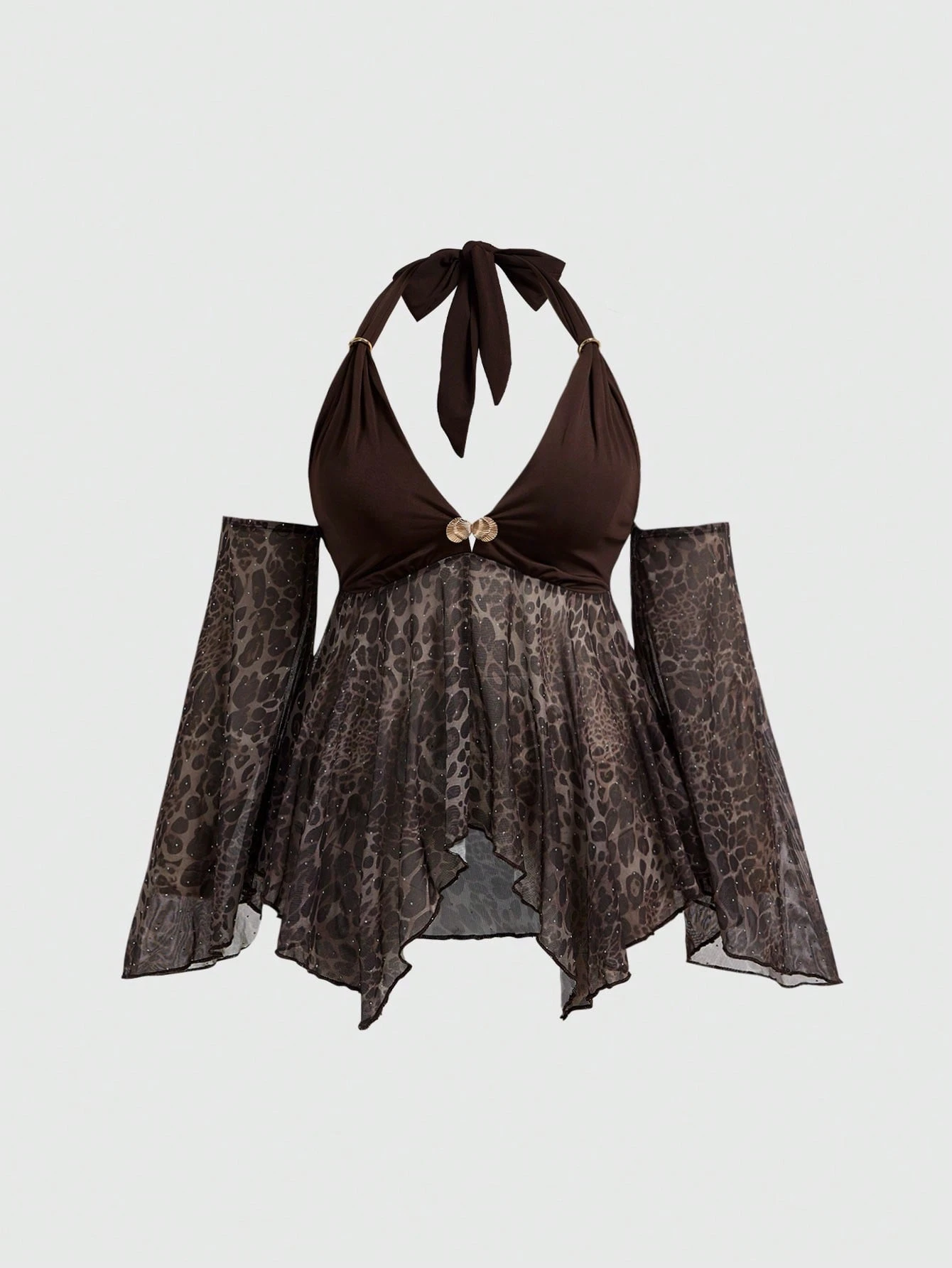 Hippie Blusa da donna taglie forti con stampa leopardata, collana con catena e strass, orlo asimmetrico e maniche a campana