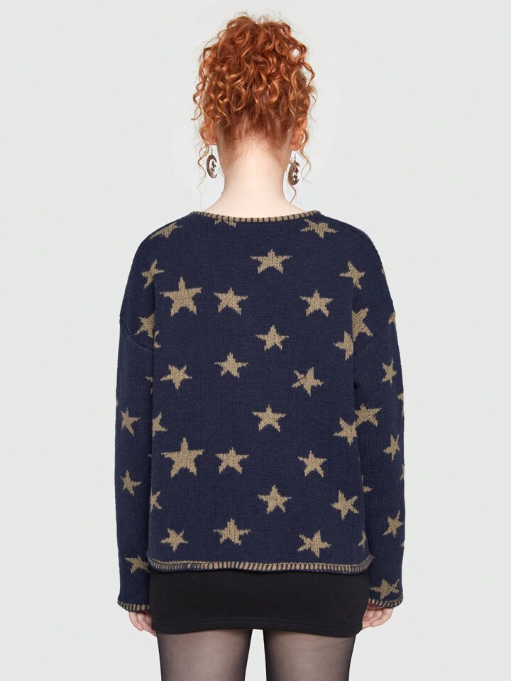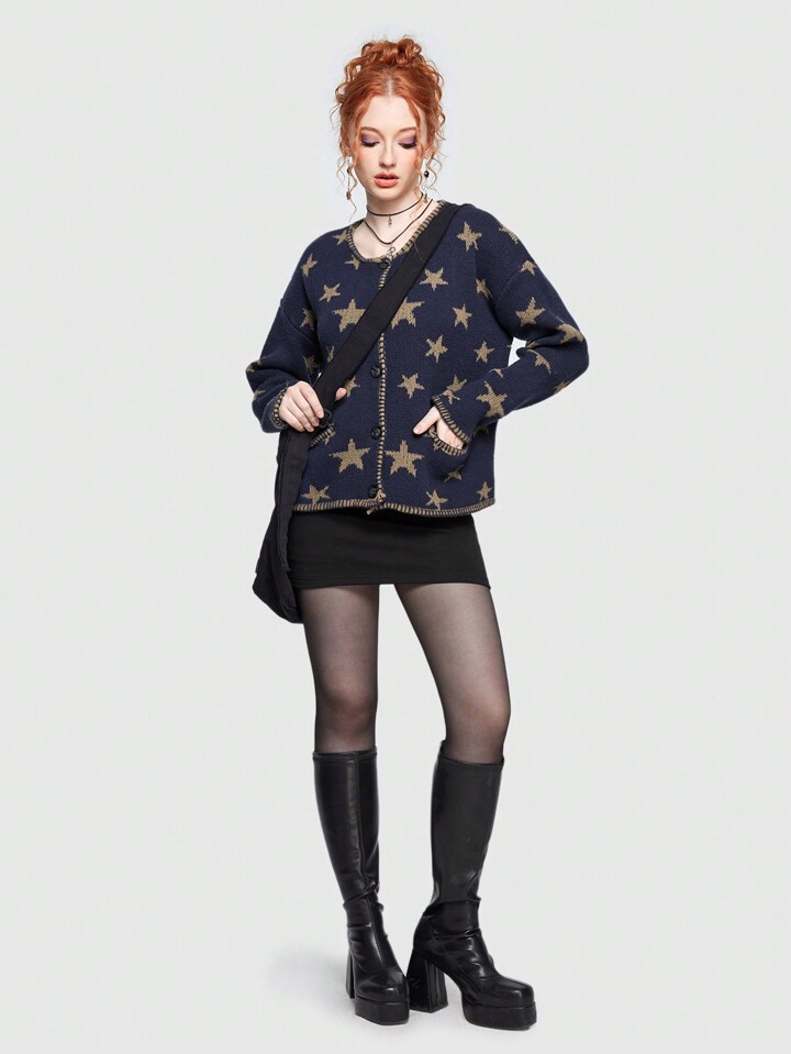 Hippie Cardigan con scollo a goccia e stampa a stelle, adatto per la scuola e per le donne in tarda primavera, casual con bottoni, tasche, collo tondo e vestibilità regular, in blu navy con stampa geometrica, per uso quotidiano casual