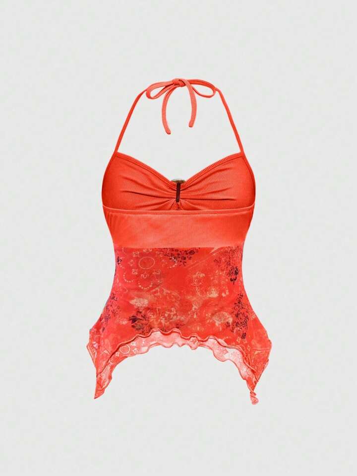 Hippie Camicetta estiva casual con stampa, con orlo asimmetrico e collo a canotta