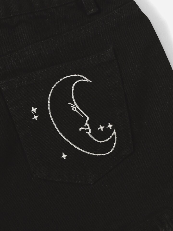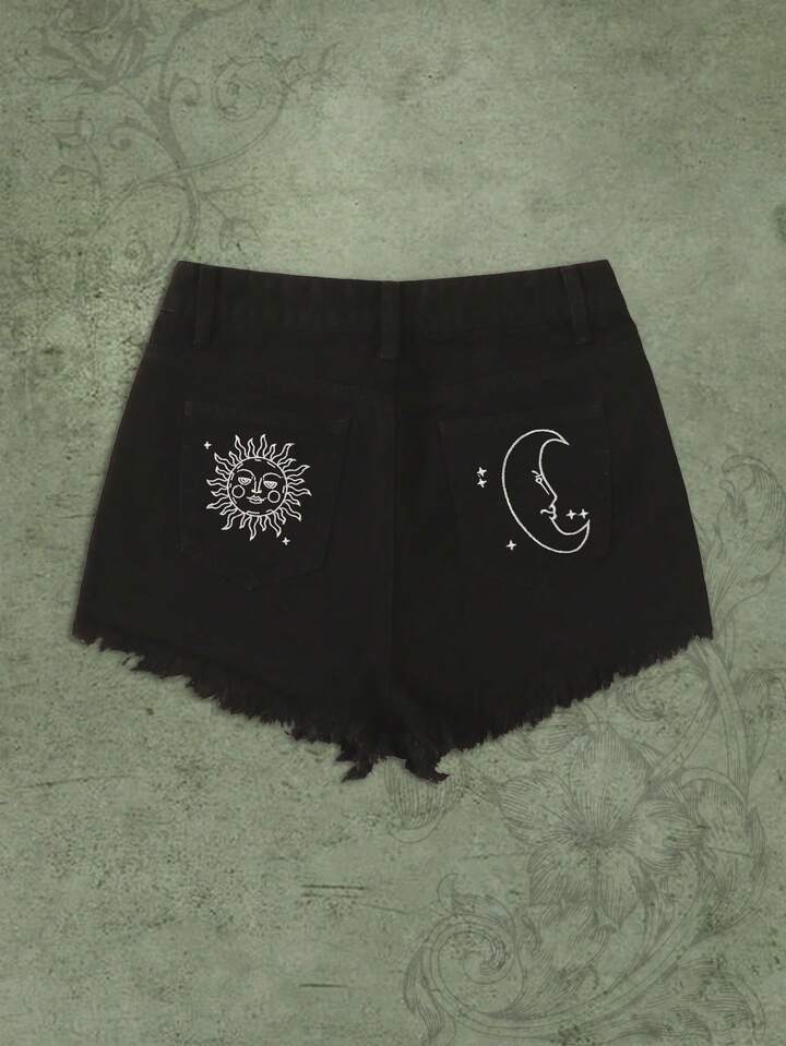 Hippie Shorts in denim con grafica luna e sole bordo grezzo