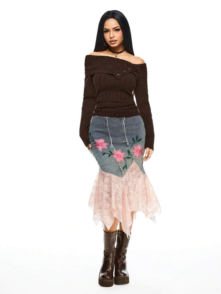 Hippie Gonnellina di jeans vintage lavata, vita bassa, asimmetrica, con inserti in pizzo e ricamo