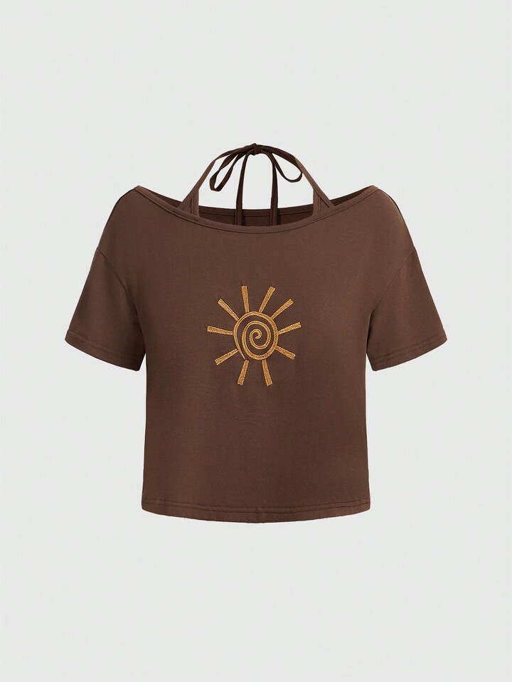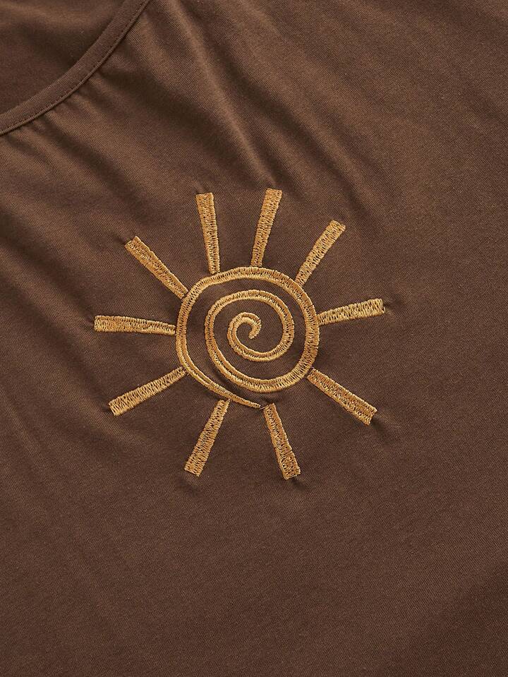 Hippie T-shirt a maniche corte con stampa di sole alla moda per donne con collo all"americana