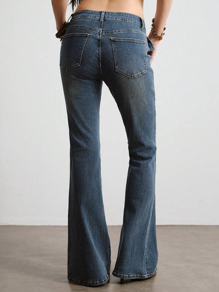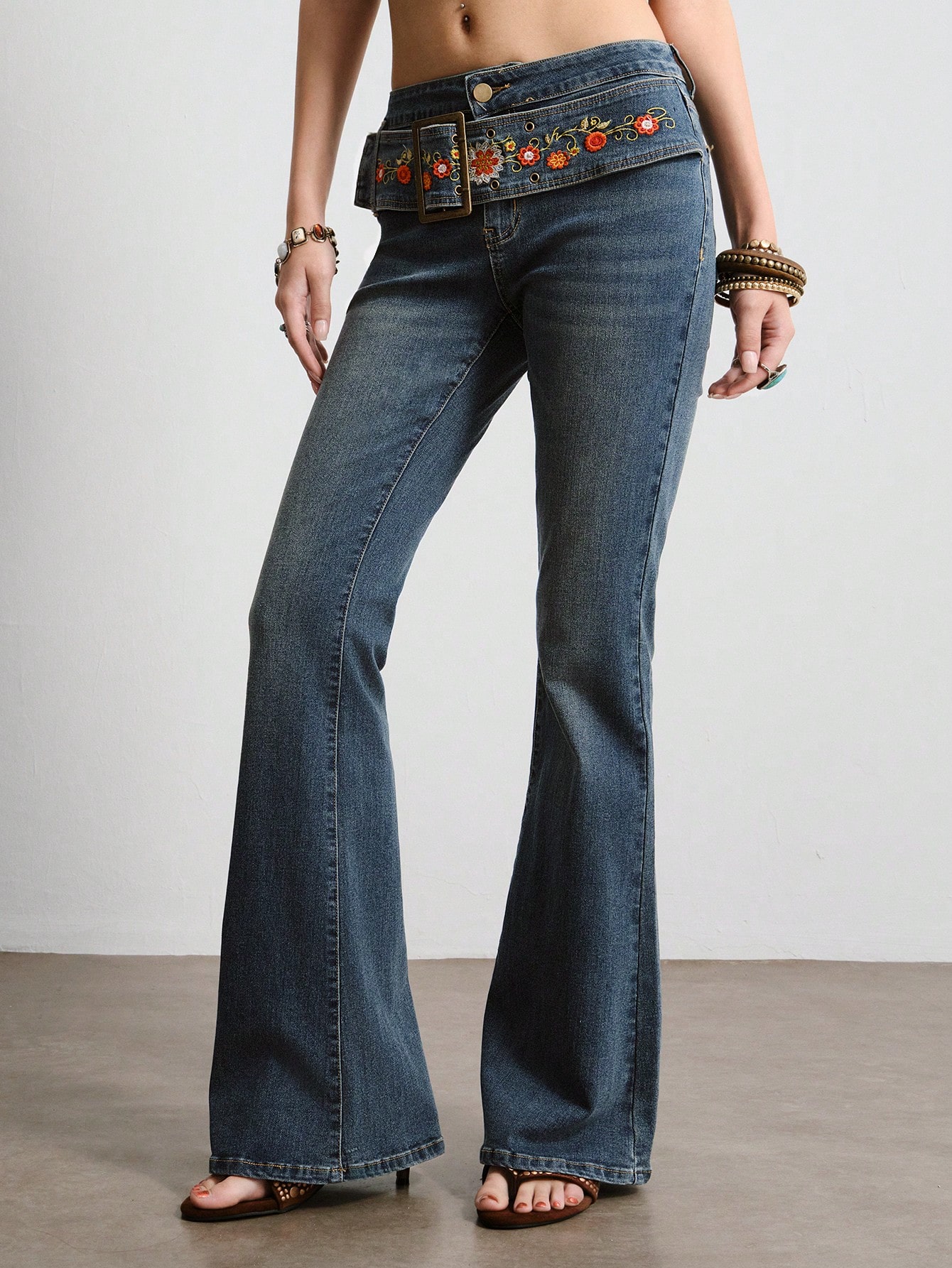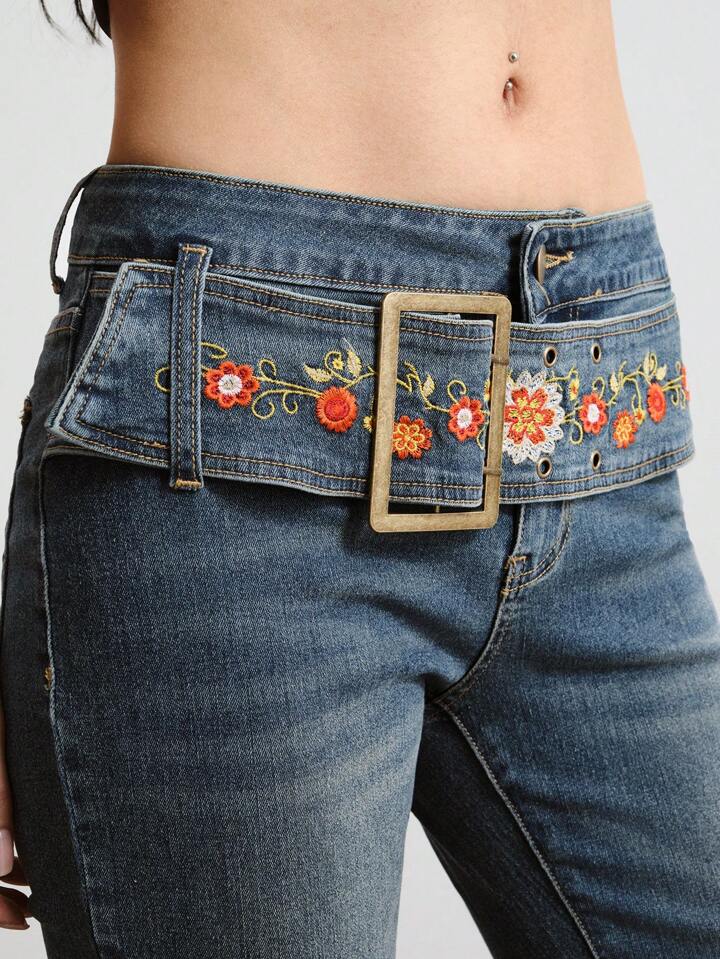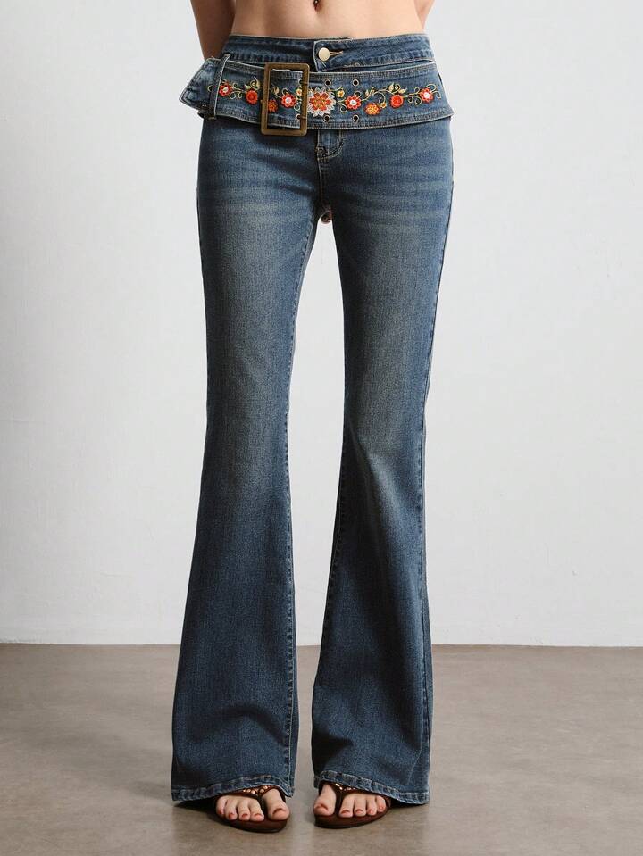 Hippie Jeans casual in denim con ricamo floreale e campana