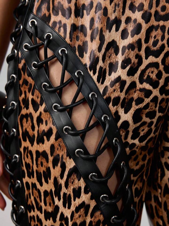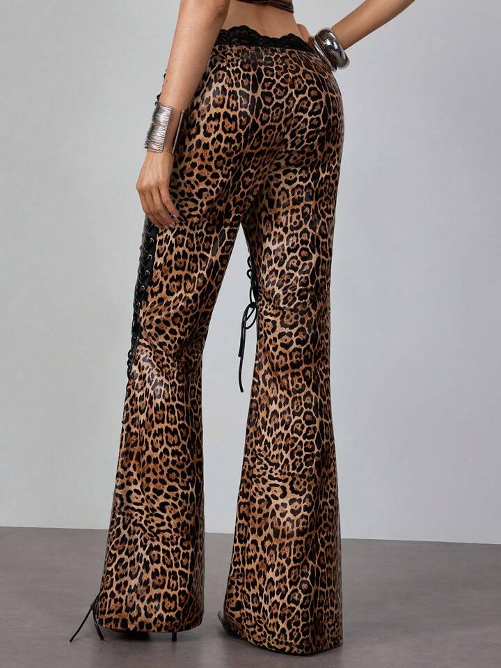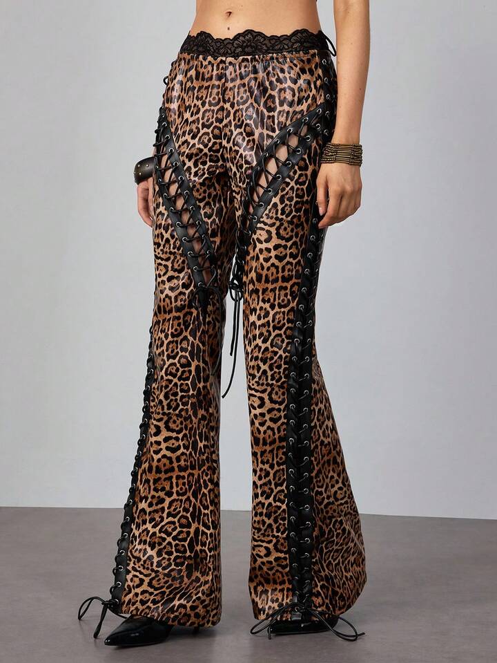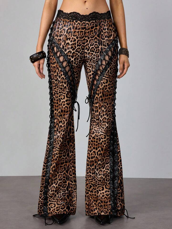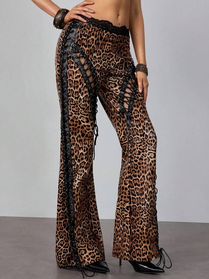 Hippie Pantaloni a zampa di leopardo retrò in stile hippy e sexy, in PU, con taglio e lacci, adatti a festival musicali delle donne