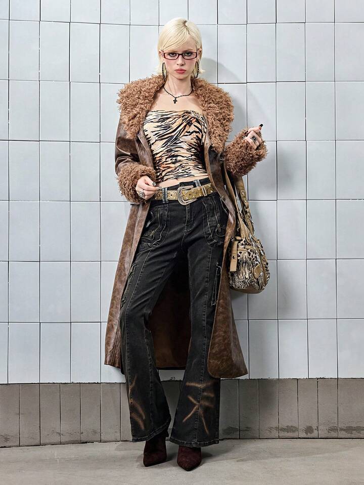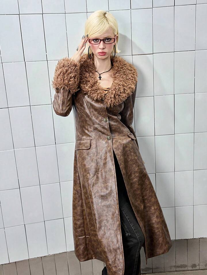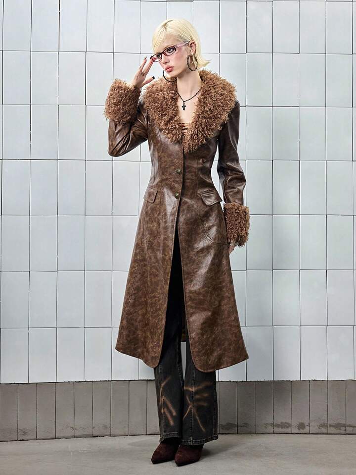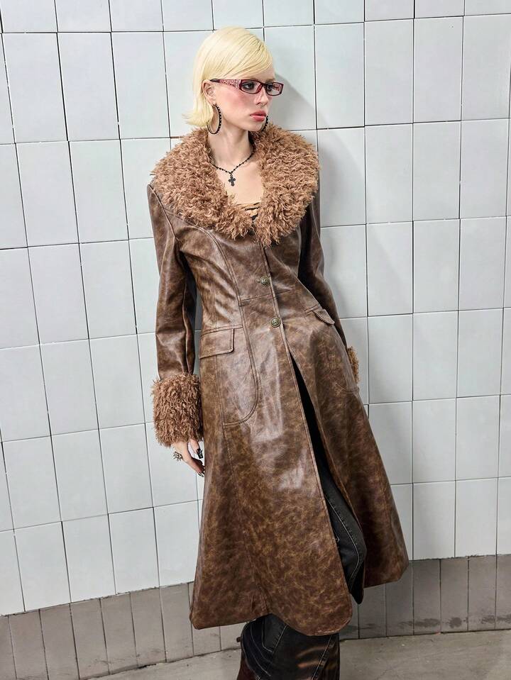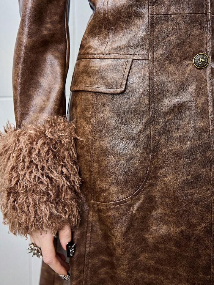 Hippie Giacca lunga da donna in stile retrò basic in pelle sintetica con inserti in pelliccia sintetica