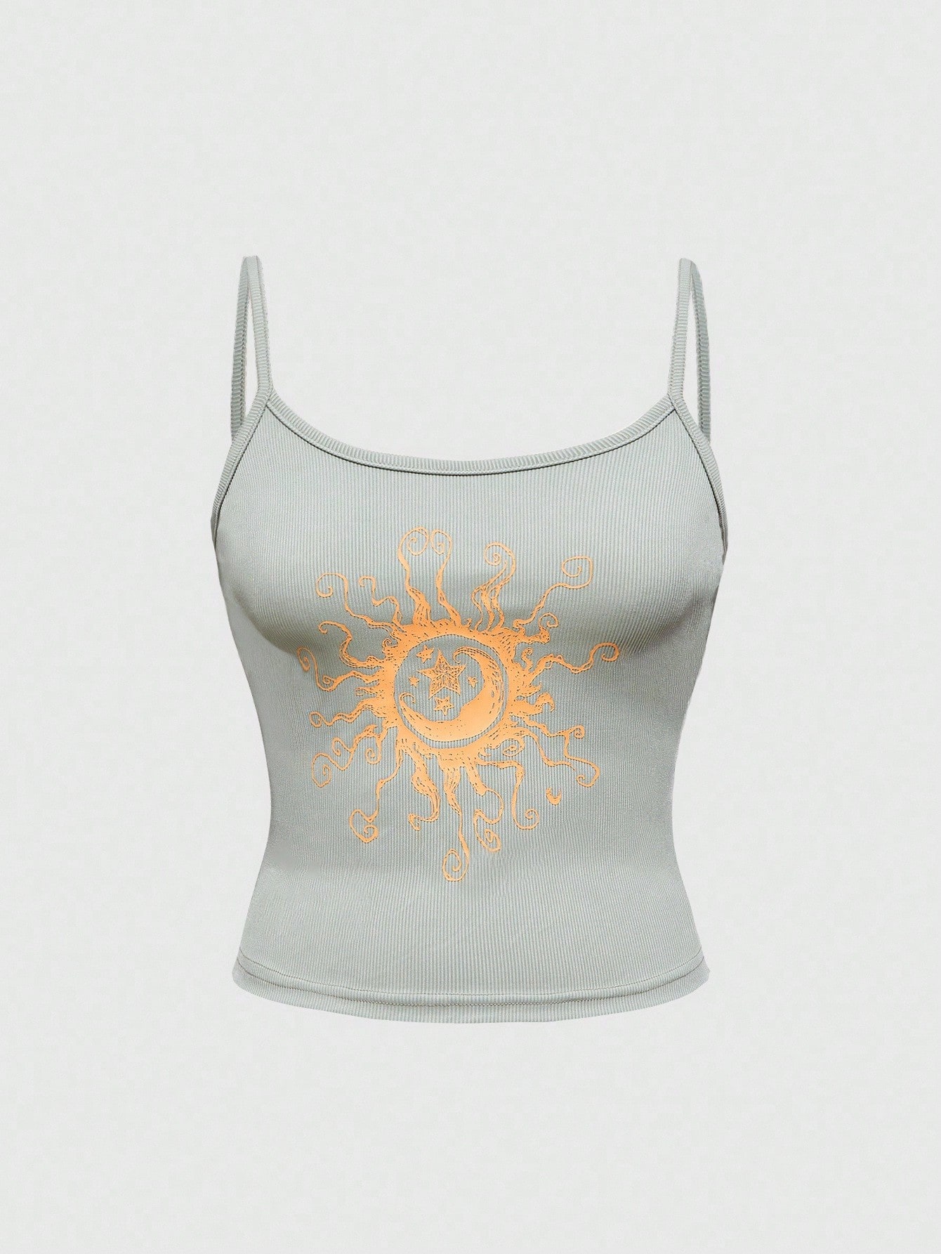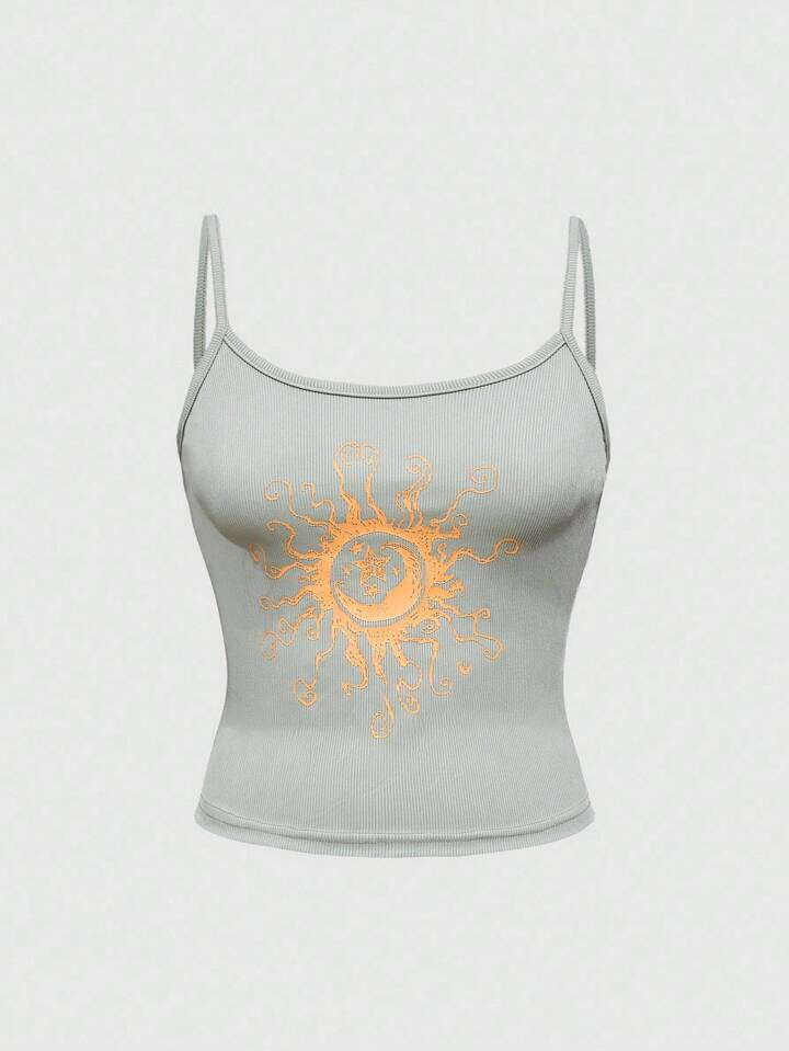 Hippie Canotta casual aderente a costine con stampa solare da donna