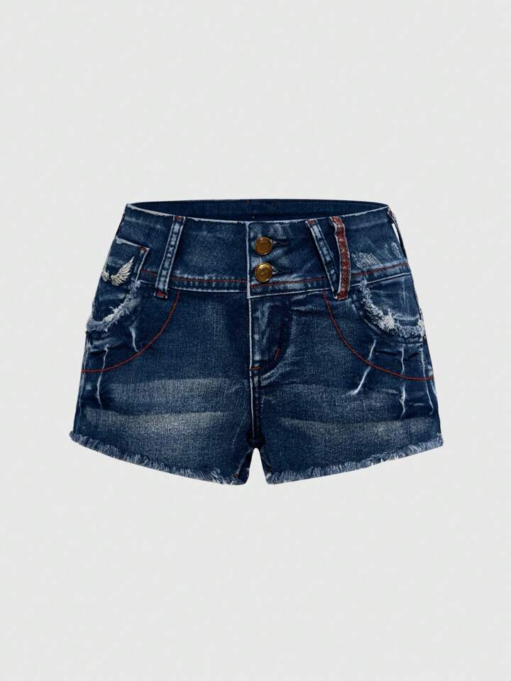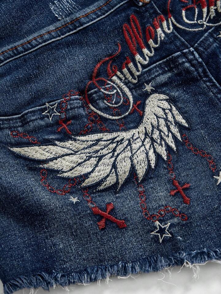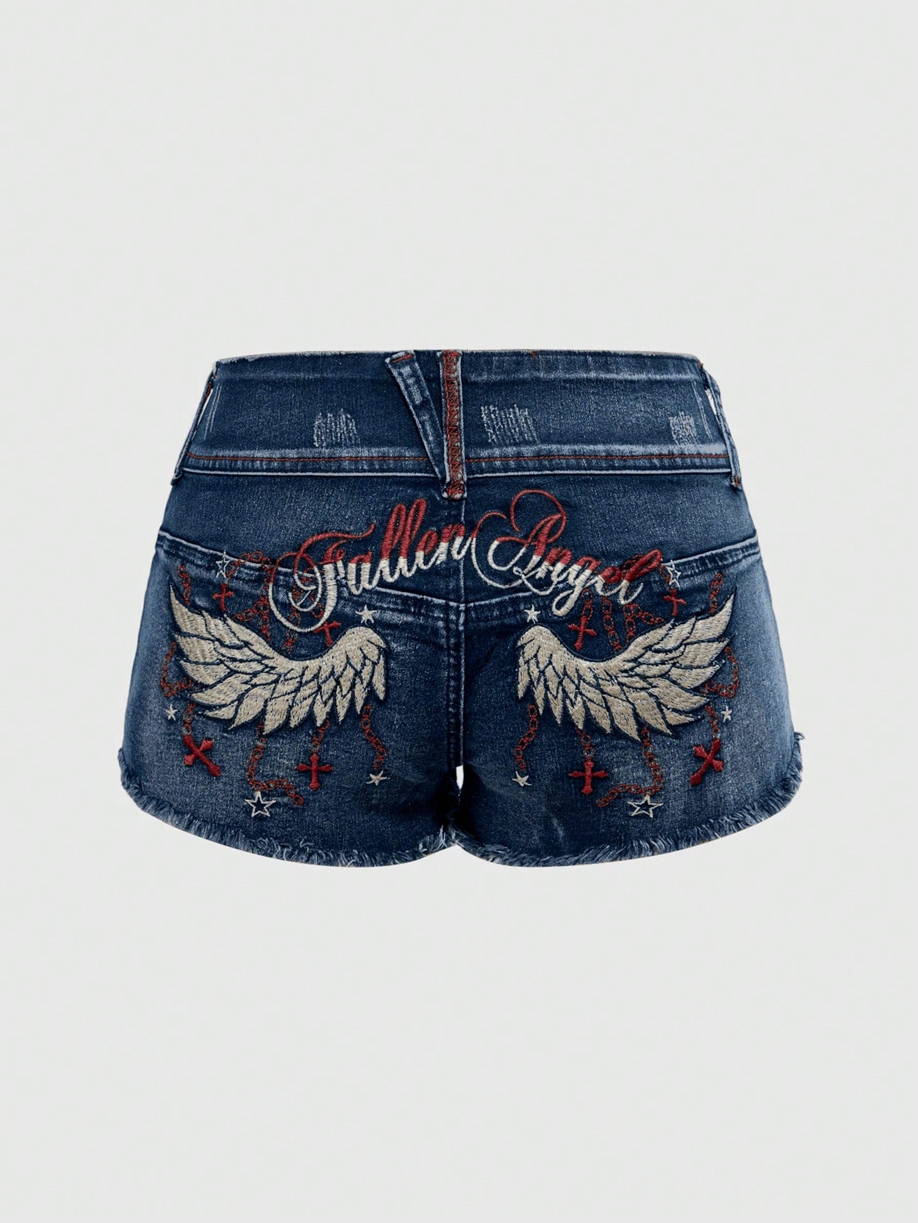 Hippie Shorts di jeans a vita bassa in stile vintage con ricami a croce e ali nello stile Y2K