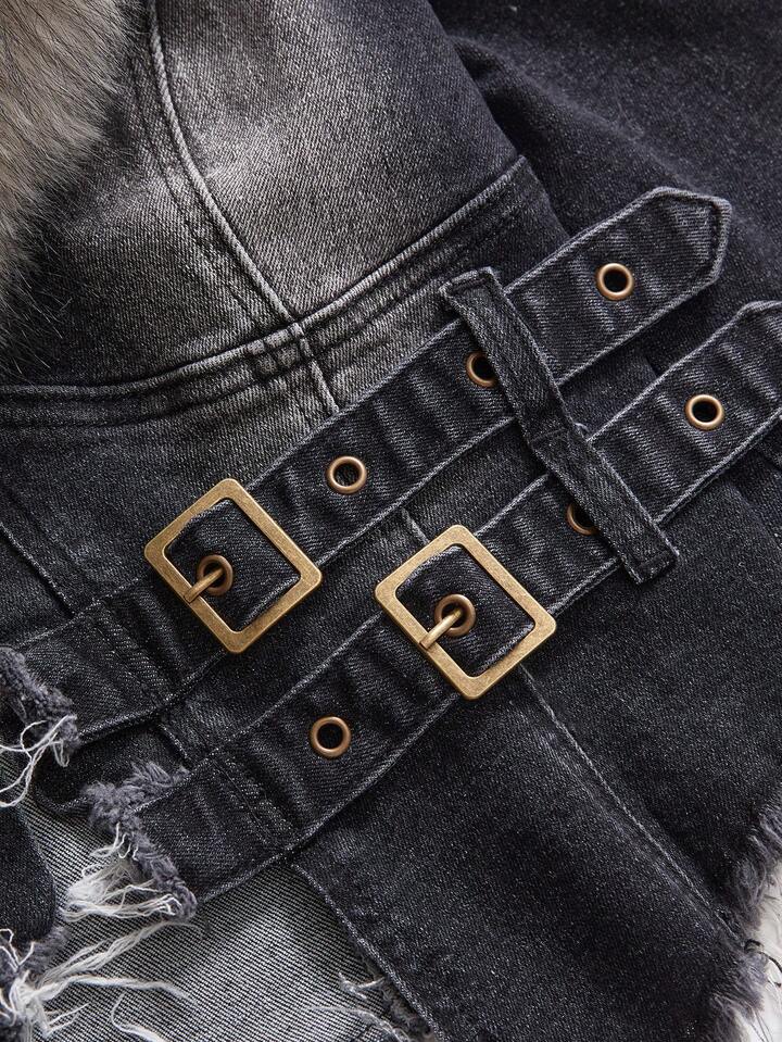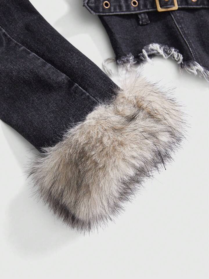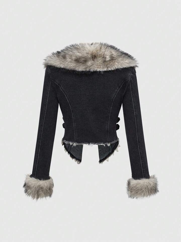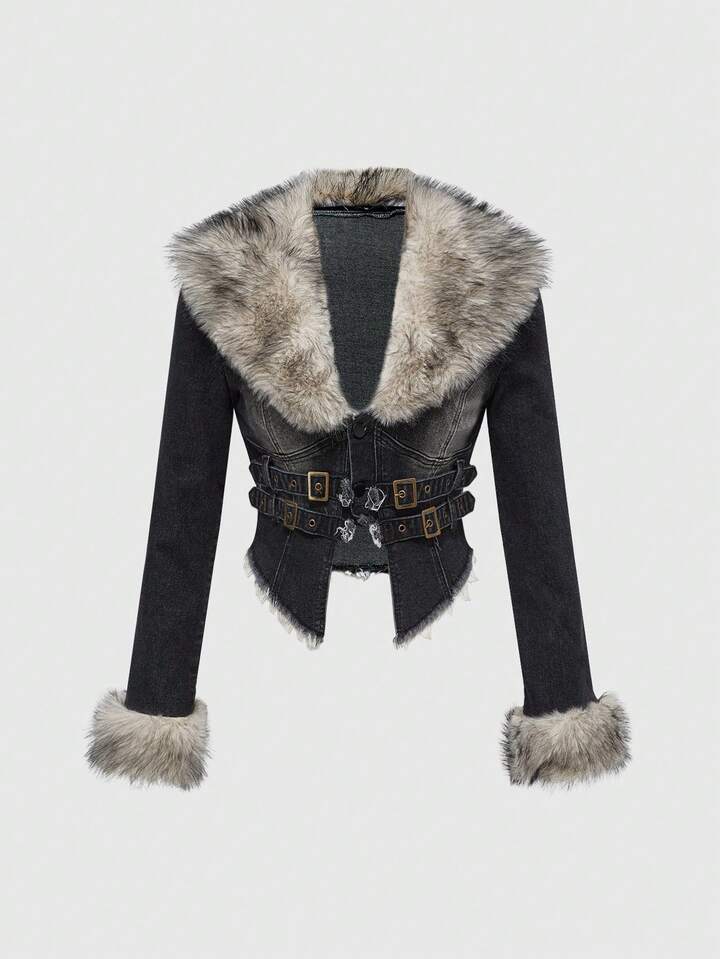 Hippie Giacca di jeans da donna con colletto in pelliccia stile Y2K