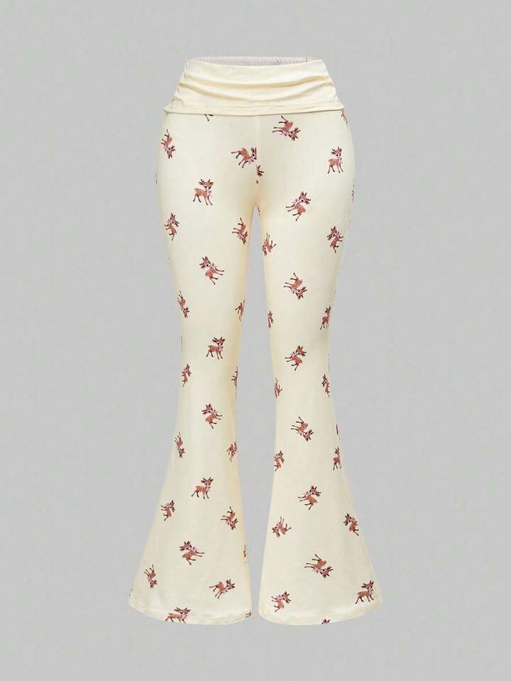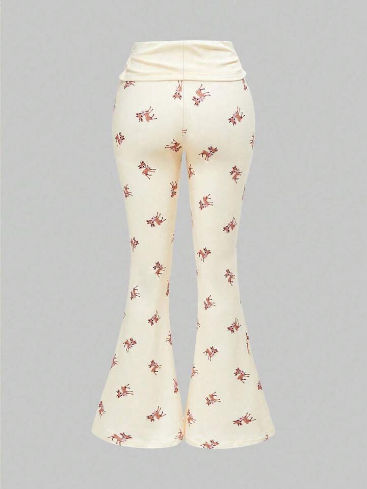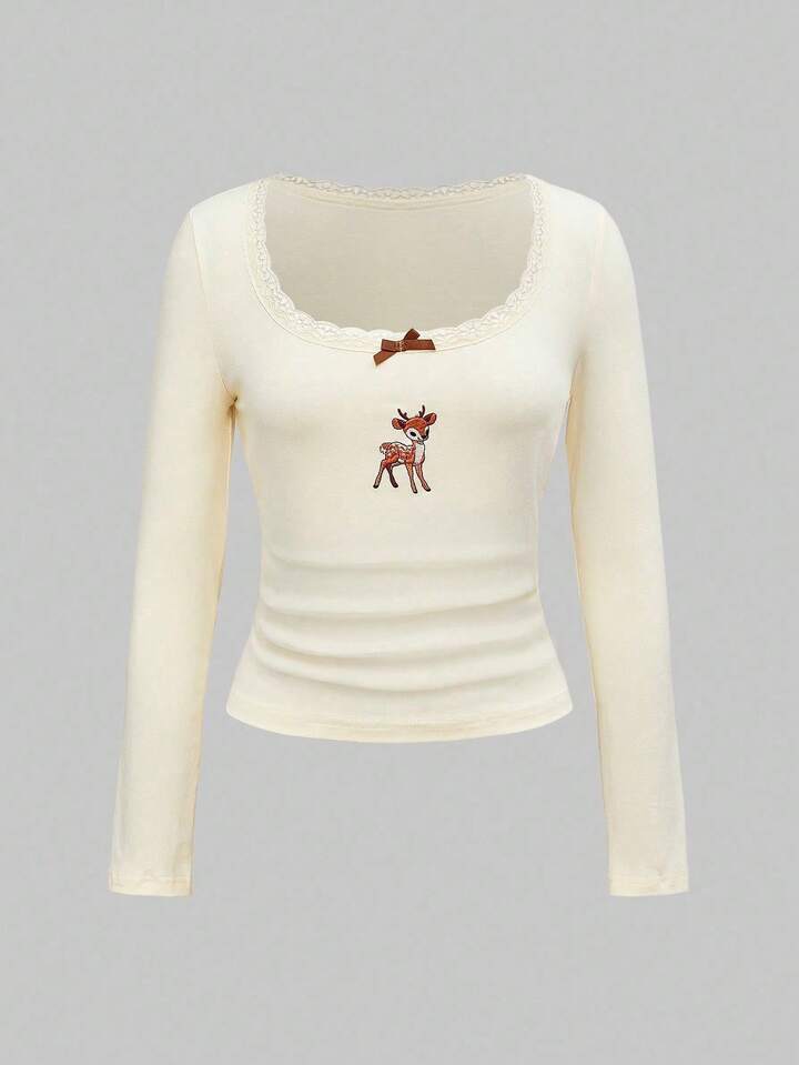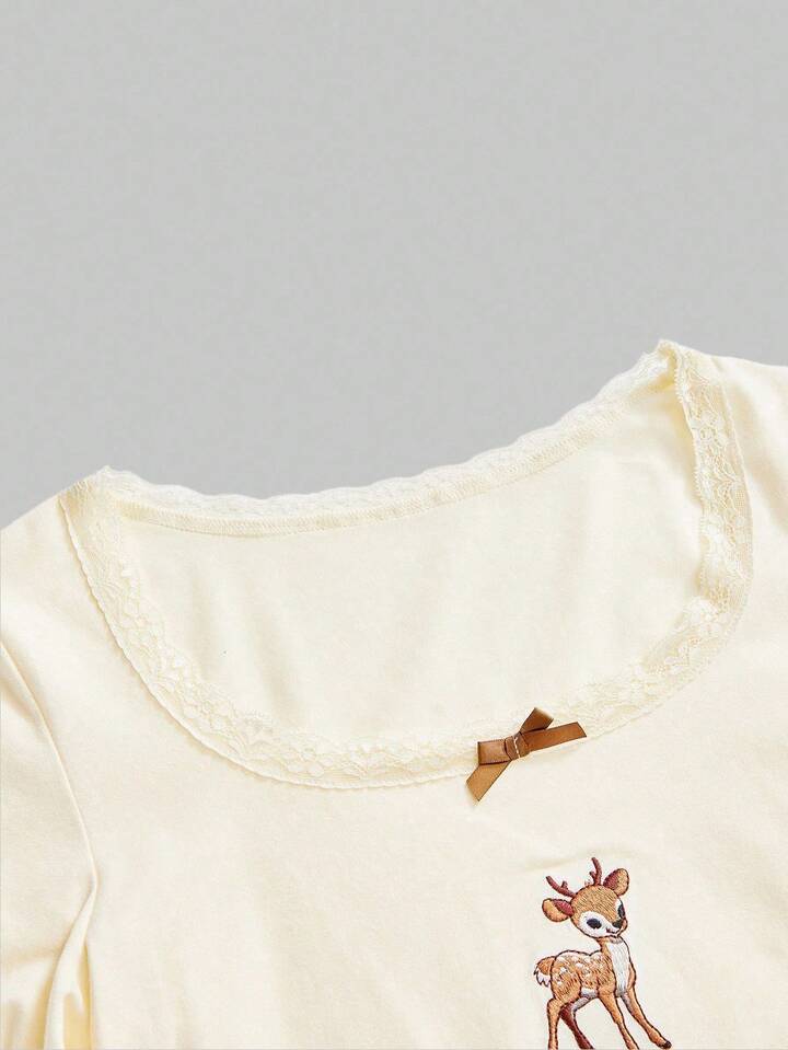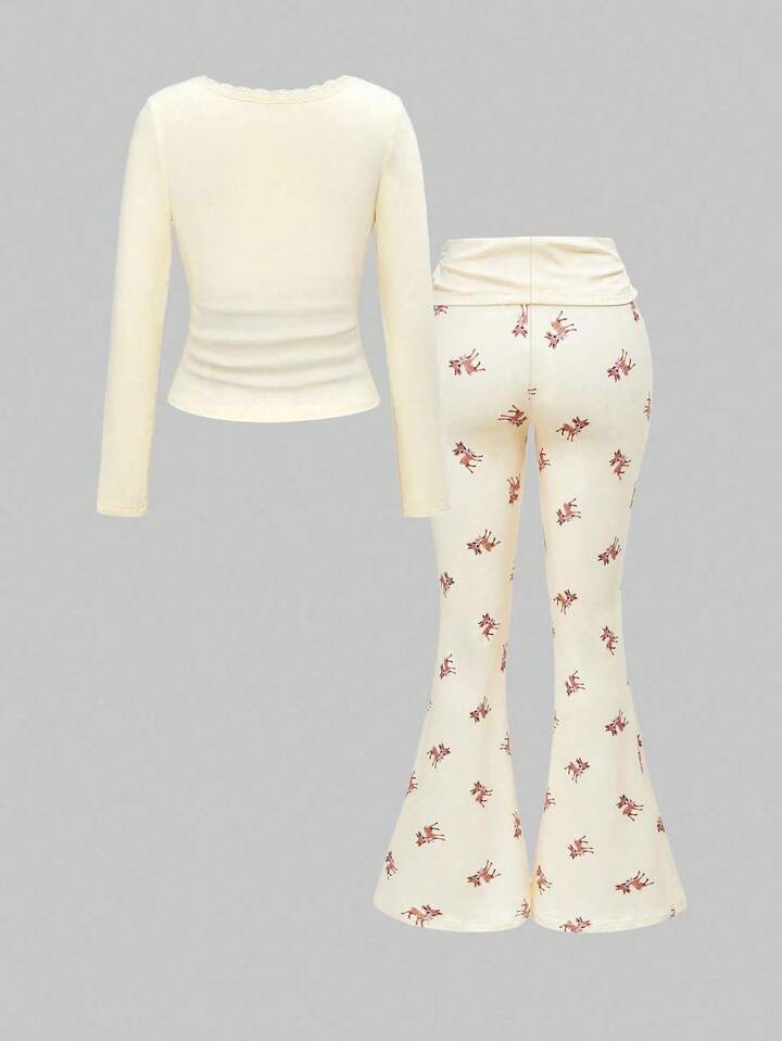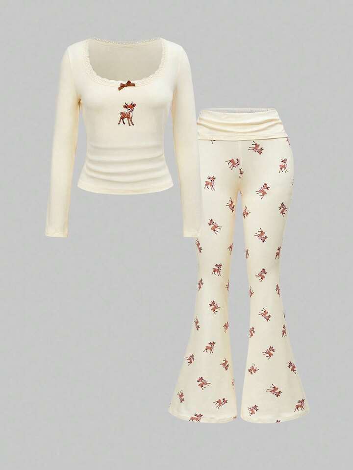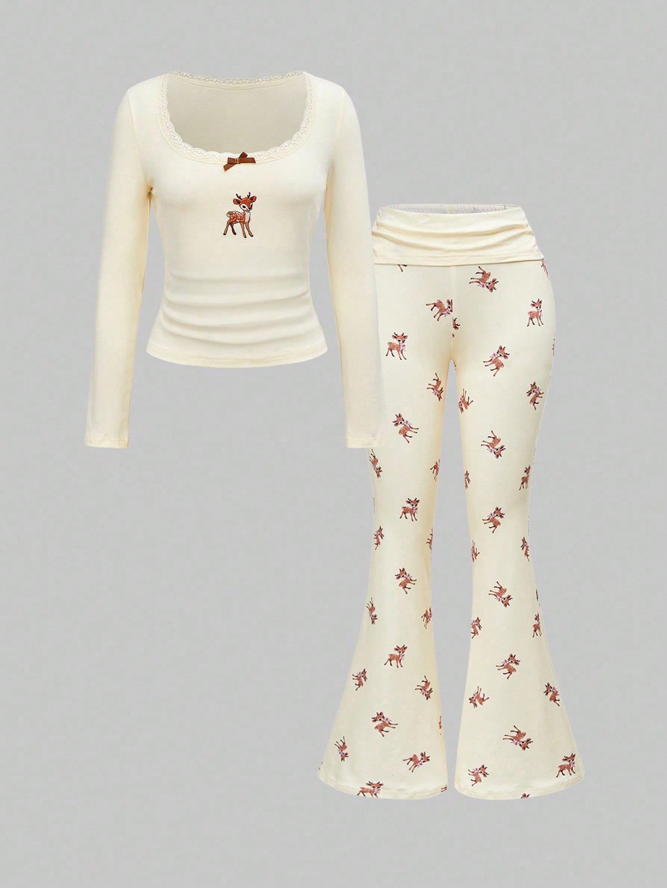 J-Fashion Blusa in pizzo ricamata con cervi abbinata a pantaloni a zampa con stampa di cervi, autunno/inverno