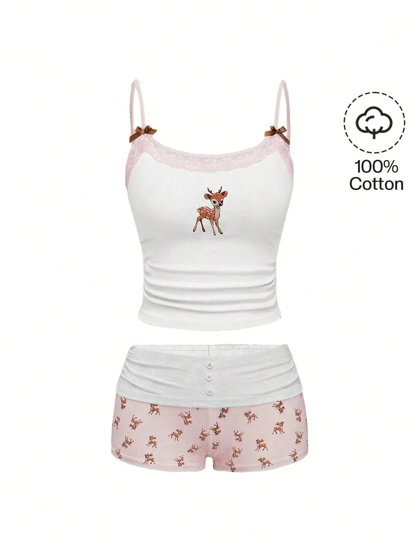 J-Fashion Blusa ricamata in pizzo con motivo a cervo abbinata a pantaloncini con stampa a cervo