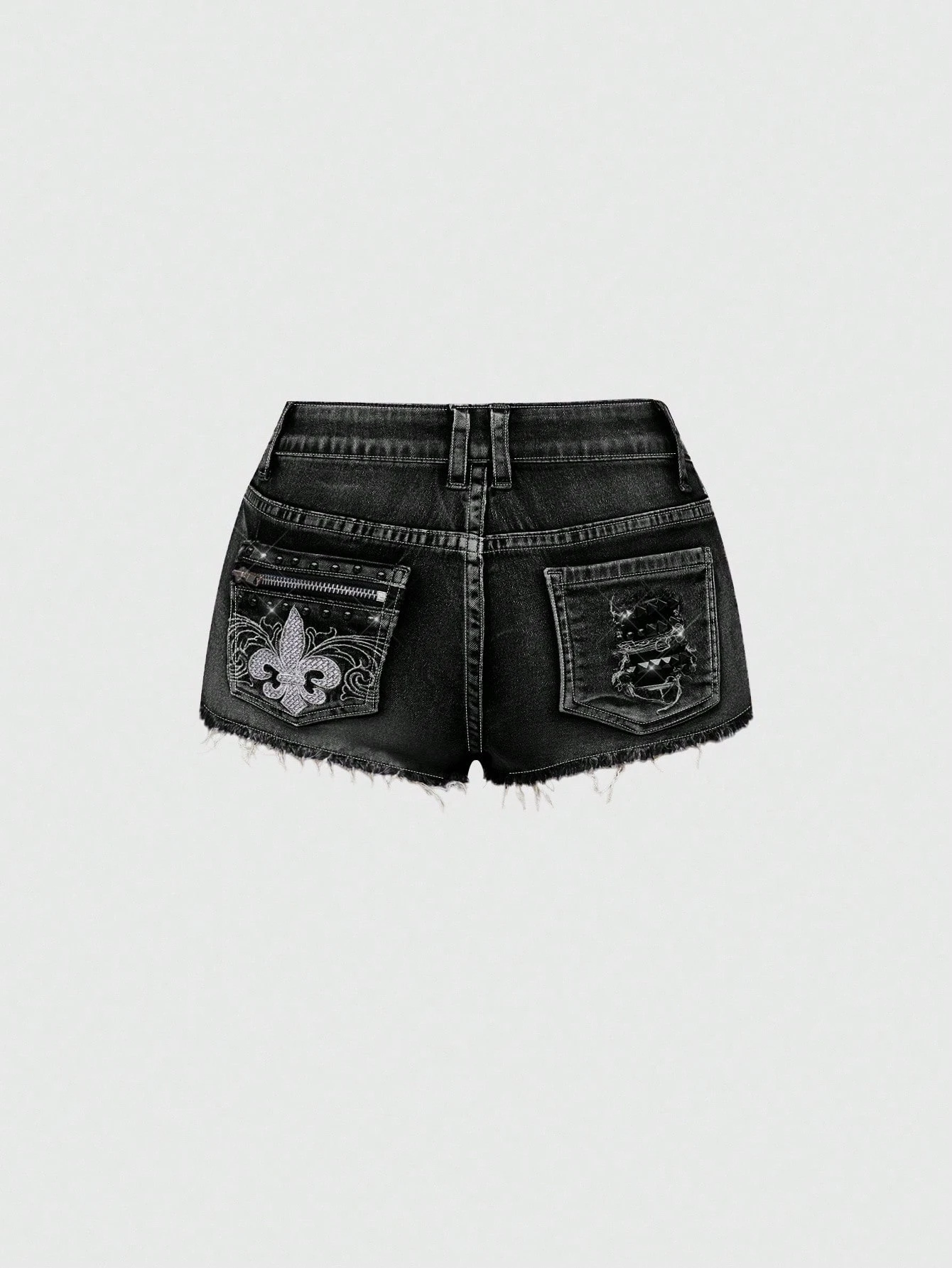J-Fashion Pantaloncini di jeans da donna in stile vintage Y2K punk, vita super bassa, super corti, con zip, rivetti, tasche e ricami