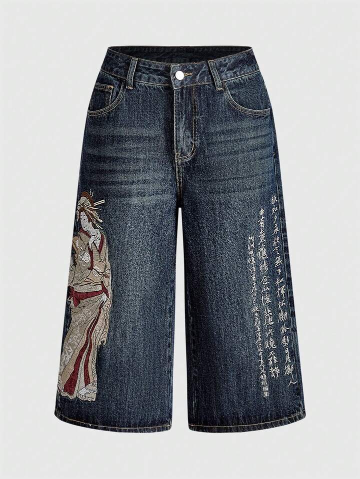 J-Fashion Jeans ampi e larghi stile retrò da strada, unisex, con ricamo di calligrafia cinese di geisha