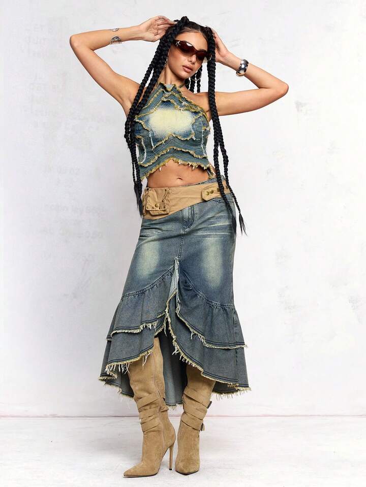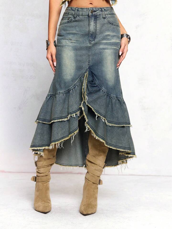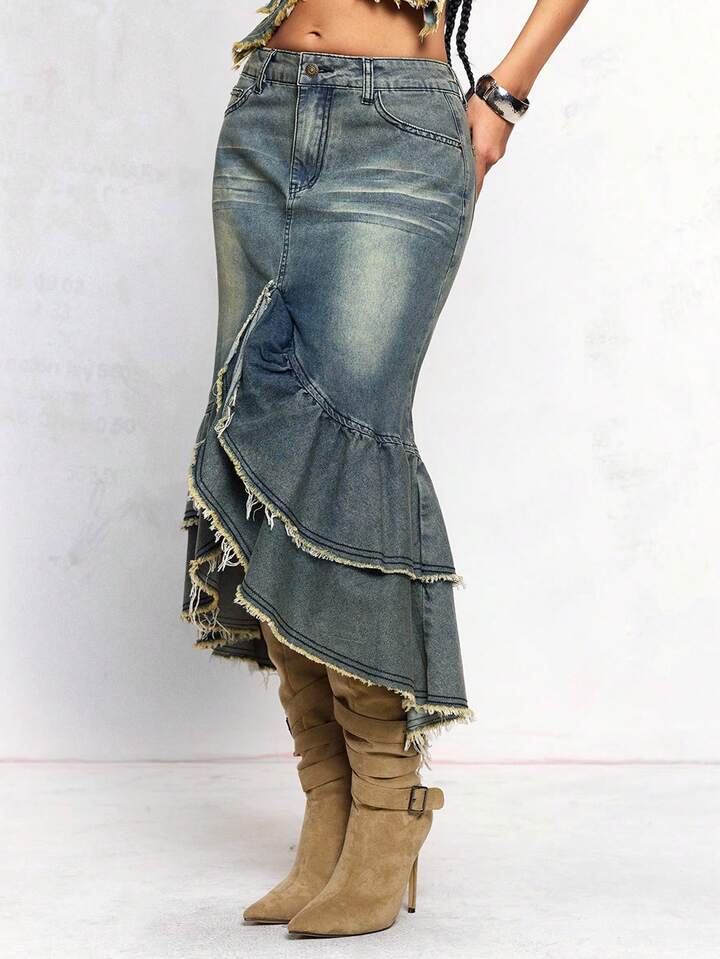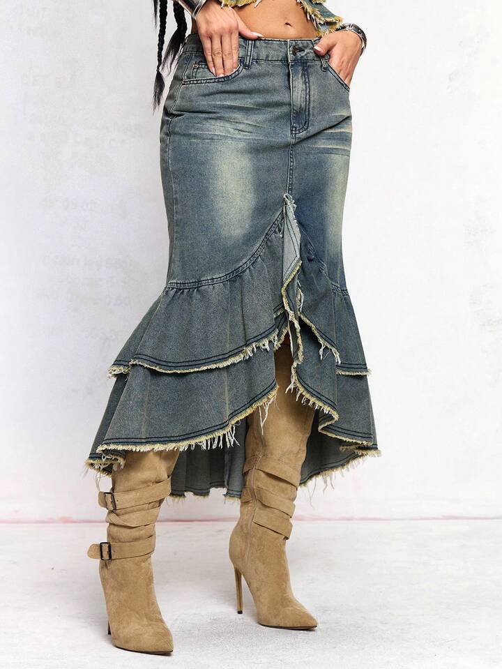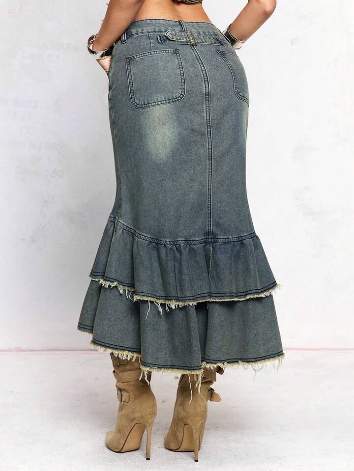 J-Fashion Gonna vintage Y2K in denim slavato con volant a balze sul fondo