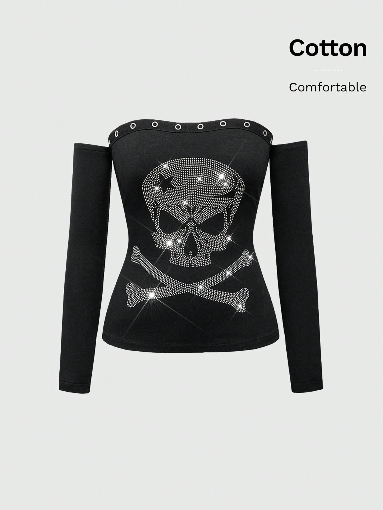 J-Fashion Maglietta casual da donna con spalle scoperte, maniche lunghe, con grafica teschio, stile minimalista