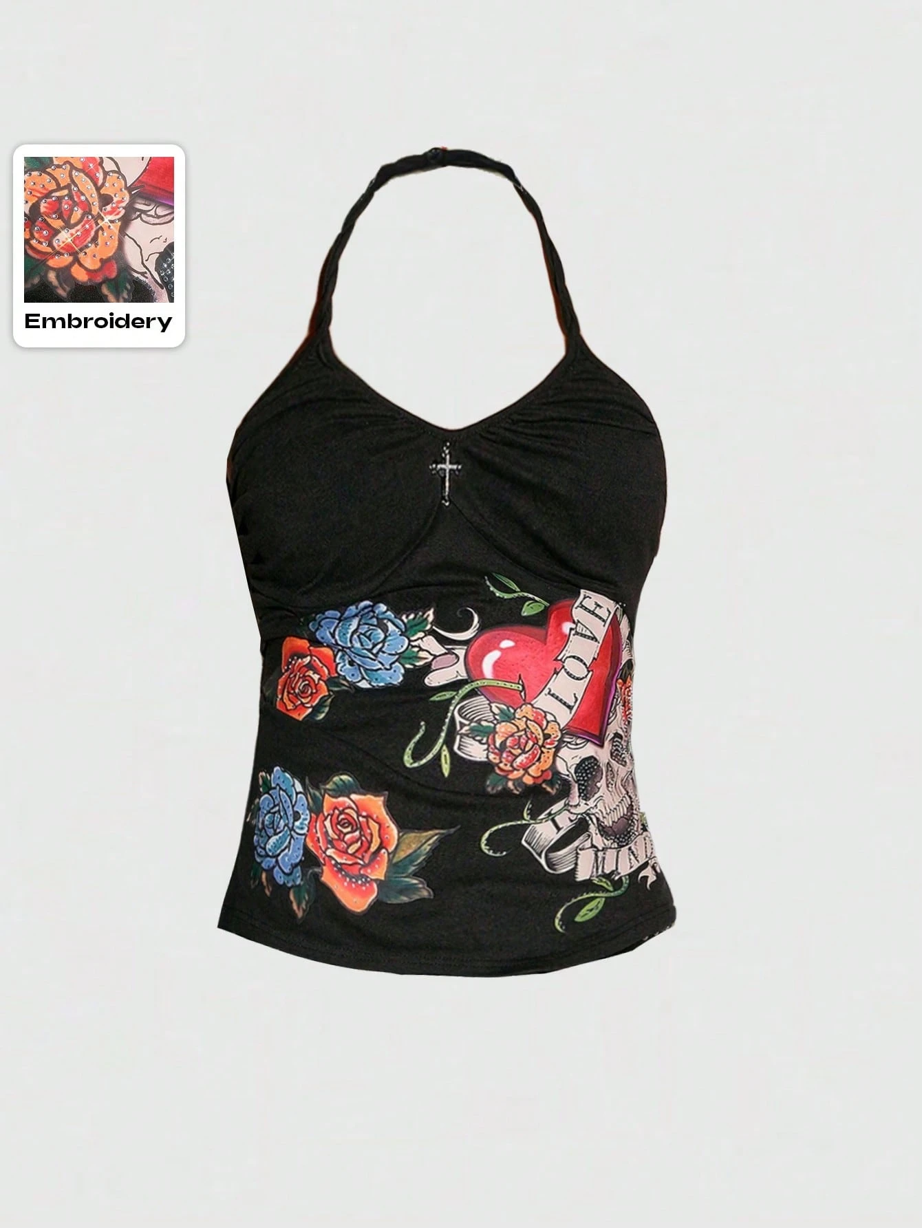 J-Fashion Top canotta con stampa tatuaggio rose e teschio nello stile Y2K, con collo alto