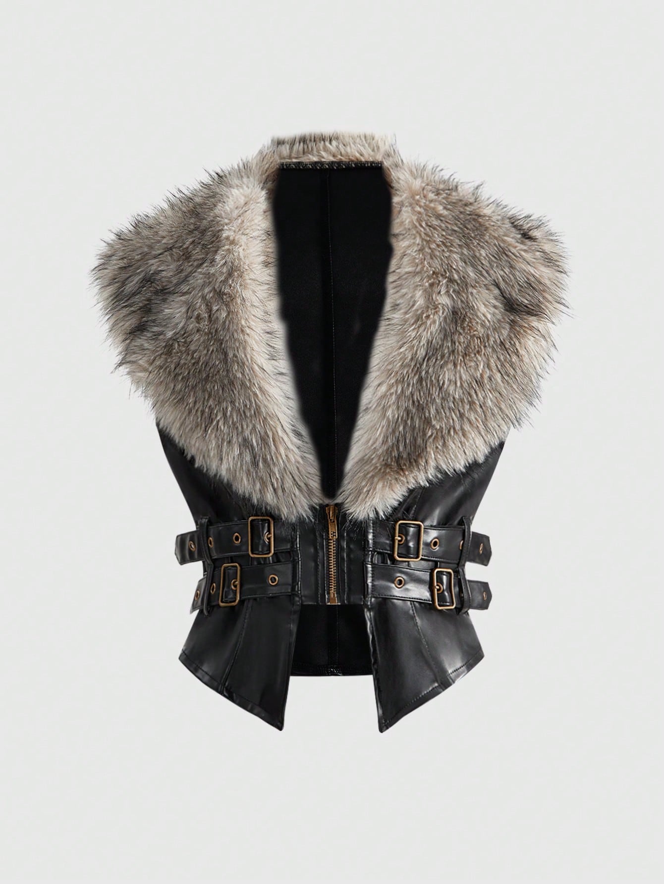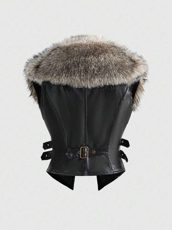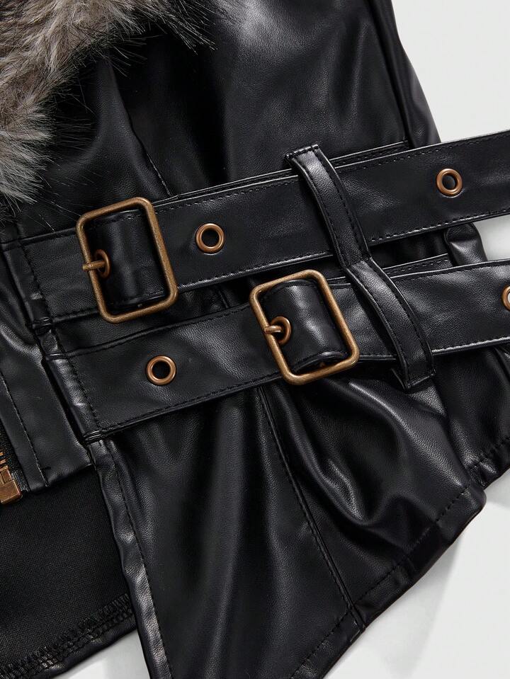 J-Fashion Giacca in pelle PU da donna con colletto in pelliccia finta staccabile, stile Y2K autunno/inverno