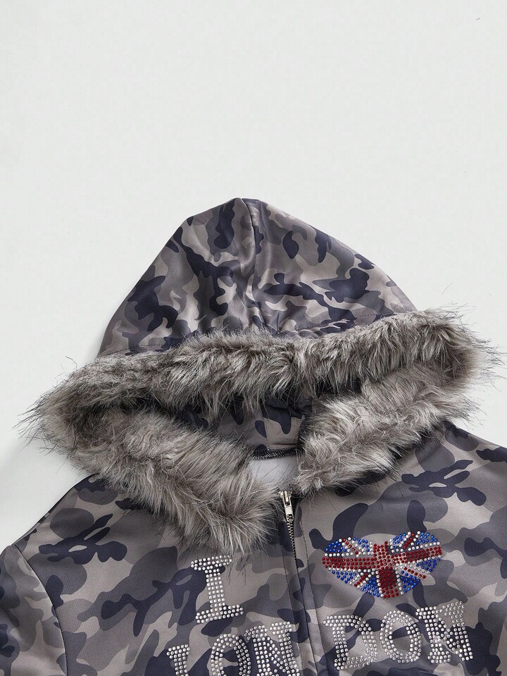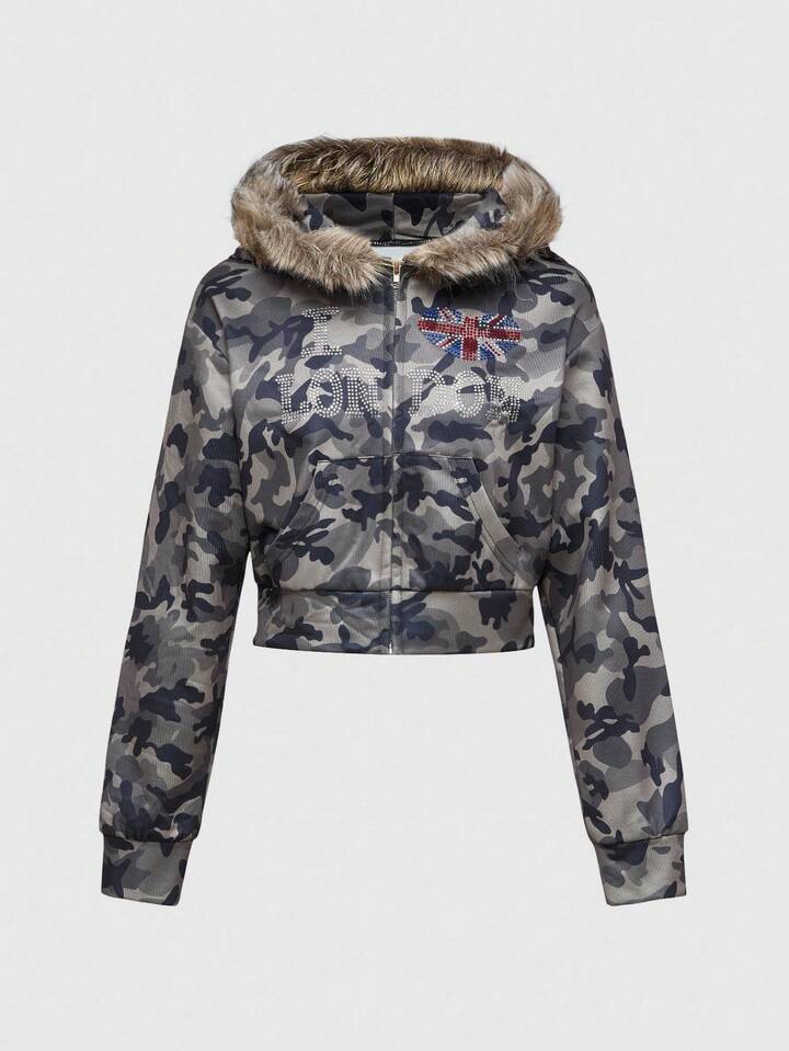 J-Fashion Felpa corta con camuflaggio e strass a bandiera inglese in stile Y2K Baddie per donne