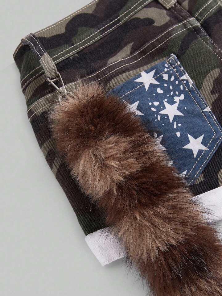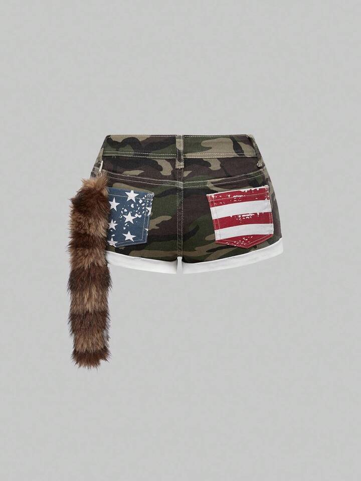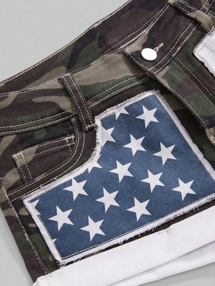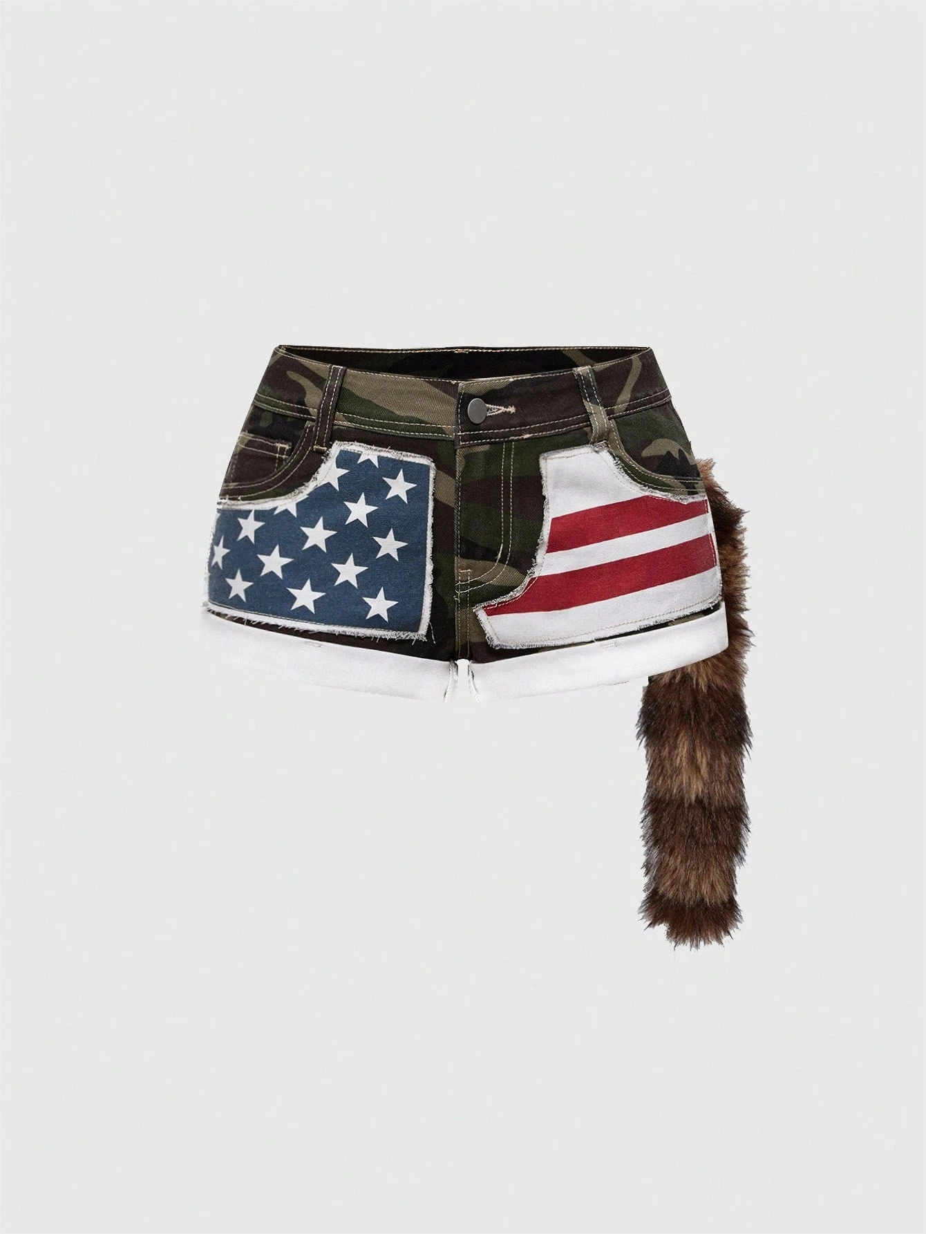 J-Fashion Pantaloncini di jeans a vita bassa con stampa di bandiere e stelle, stile Y2K