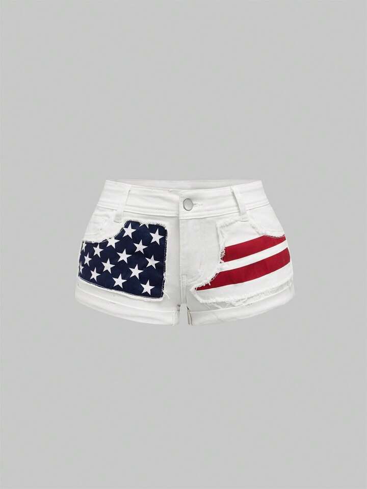 J-Fashion Pantaloncini di jeans a vita bassa con stampa di bandiere e stelle, stile Y2K