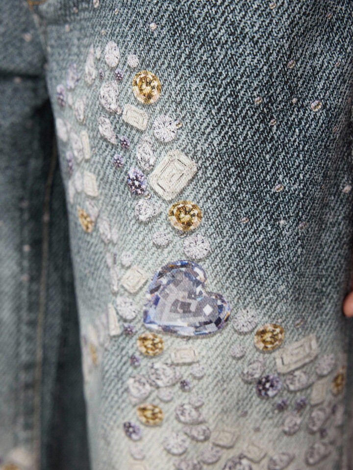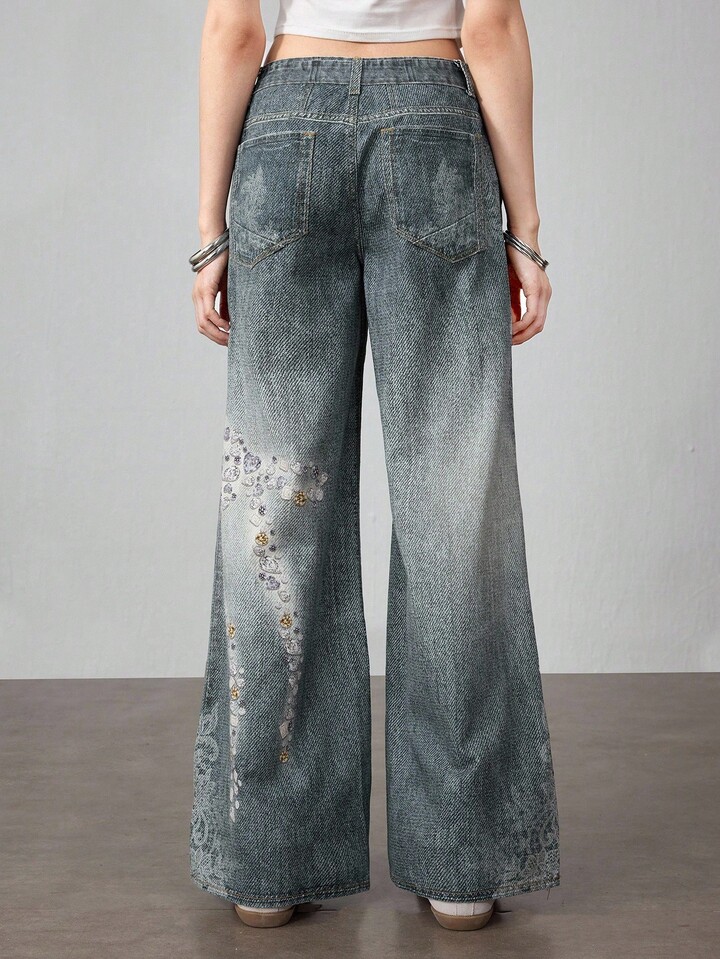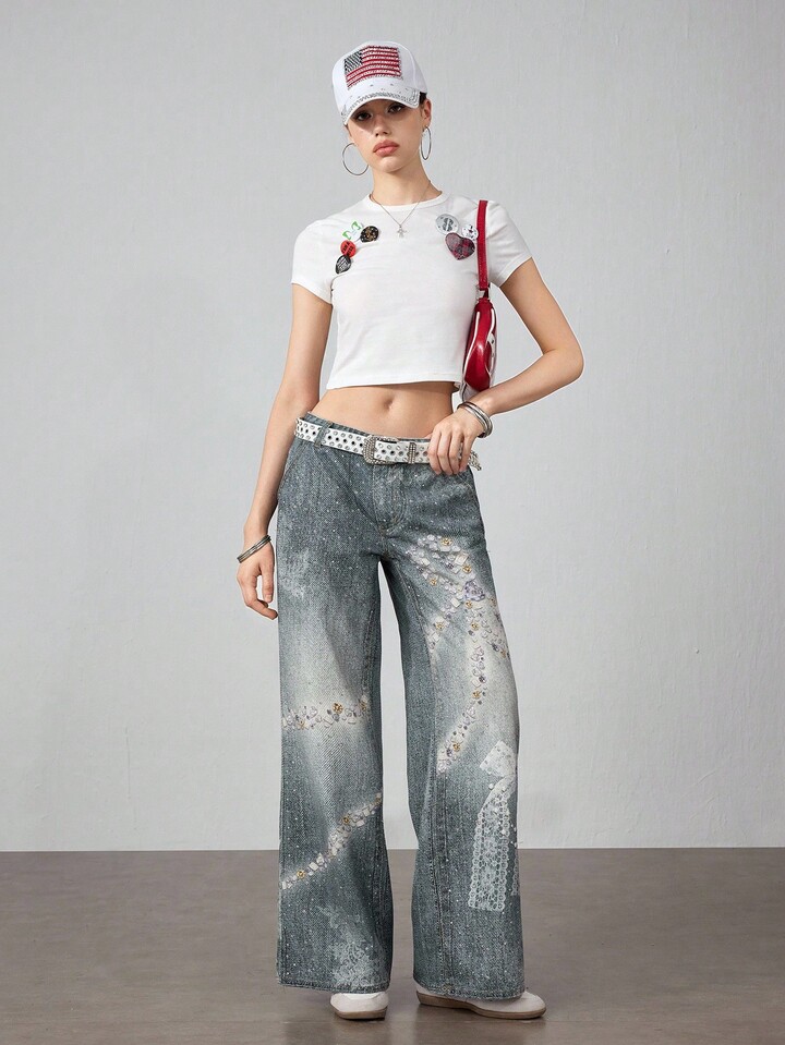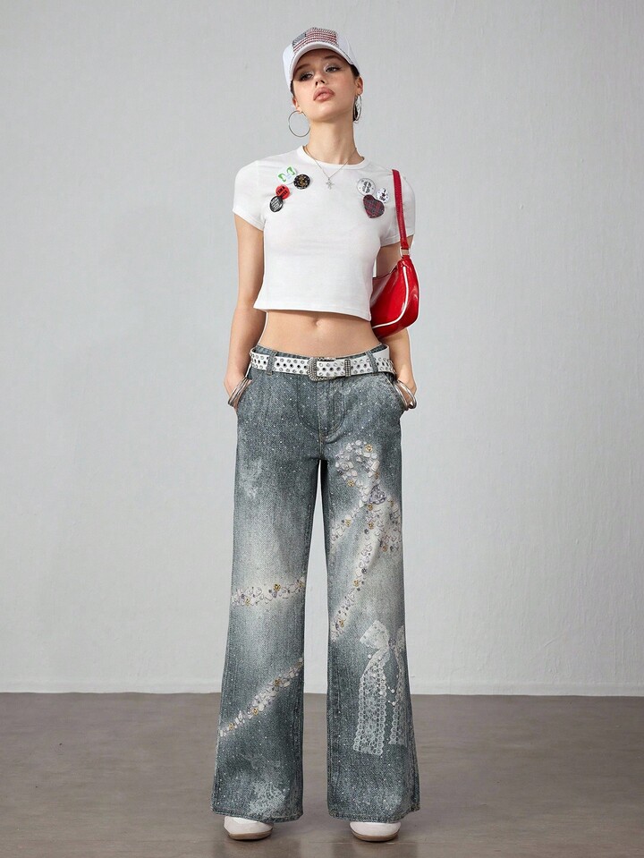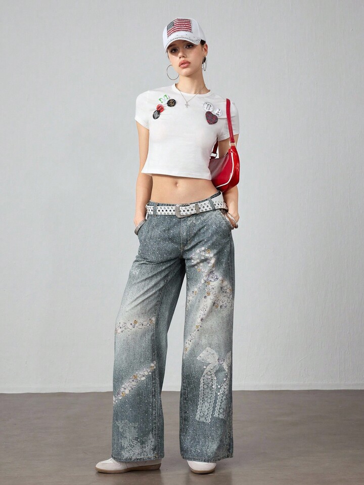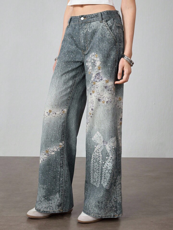 J-Fashion Jeans a vita bassa con stampa in pizzo a farfalla in stile retrò Y2K per donne