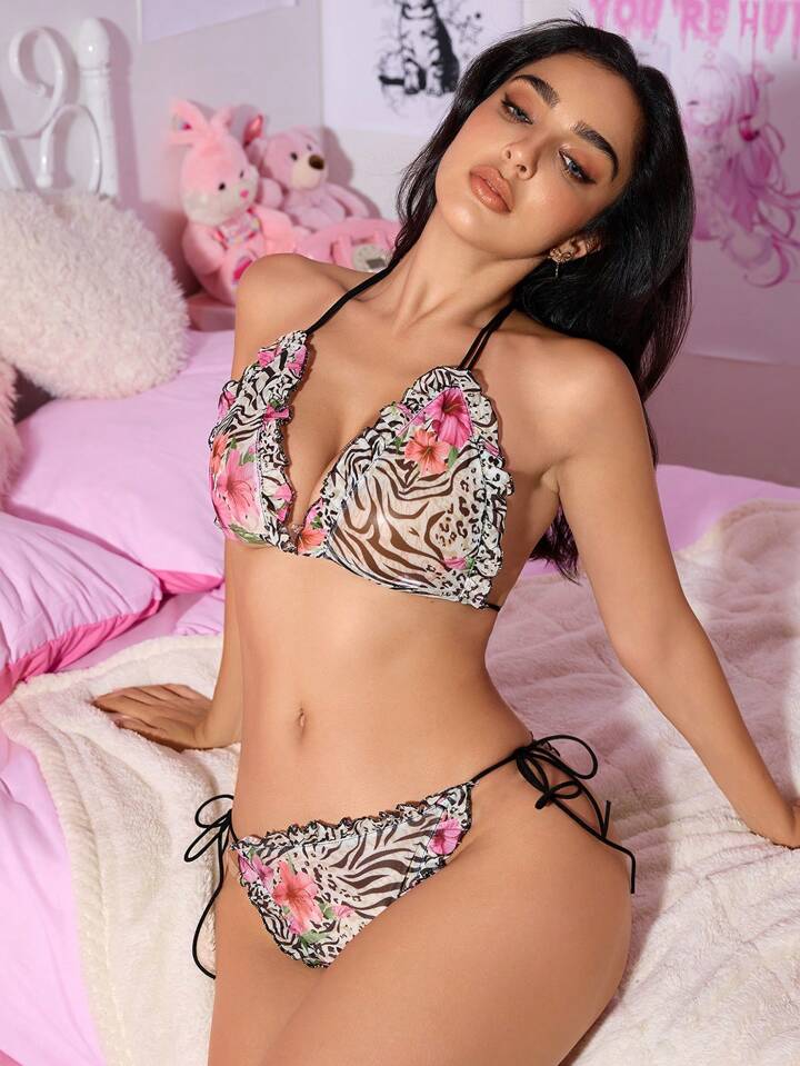 J-Fashion Reggiseno senza ferretto con rouches e nodo anteriore, stampa retrò Y2K a fiori e strisce di zebra, adatto per l'estate