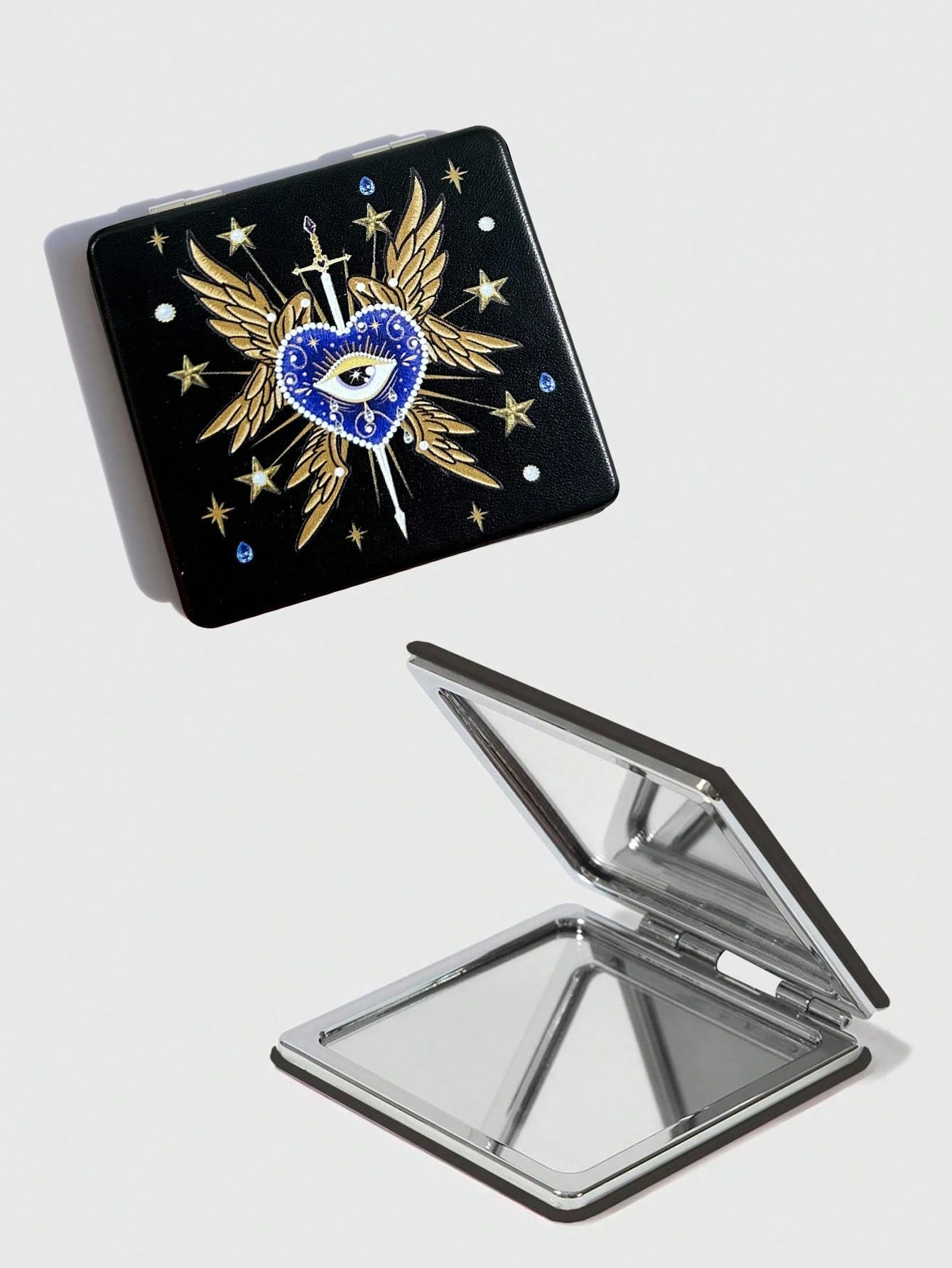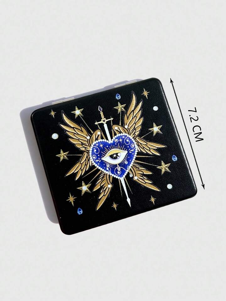 Kawaii 1 Pezzo Specchio quadrato portatile con stampa di occhio, cuore e croce, per il trucco delle ragazze (posizionamento casuale del motivo)