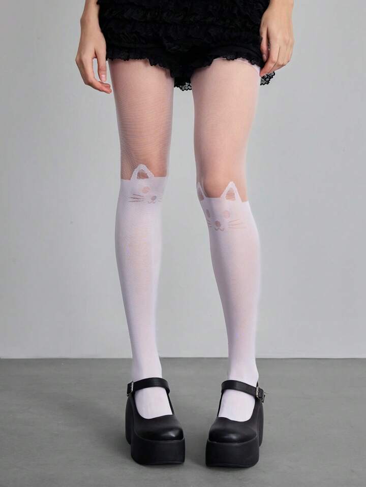 Kawaii 1 Paio di Sexy Calze a Rete Bianche a Motivo di Gattino Stile Vixen, Affascinanti Collant Trasparenti Elastici a Motivo Geometrico per Stratificare