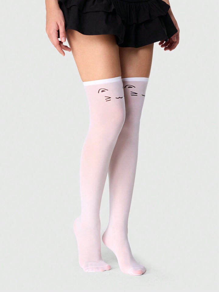 Kawaii 1 Paio Di Calze Bianche Al Ginocchio Con Stampa Gatto Carina, Elastiche E Snellenti, Calze A Leggings Sottili