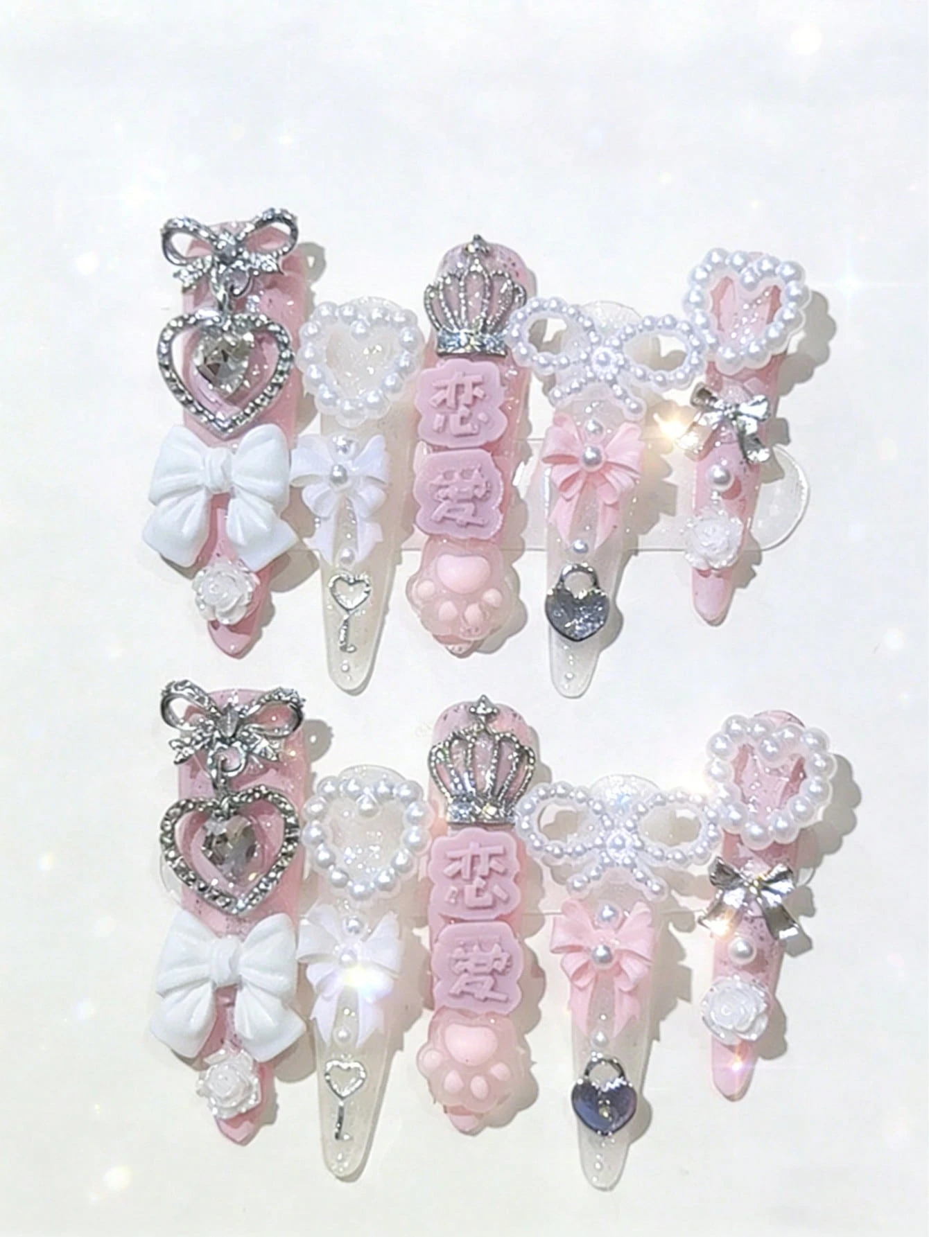 Kawaii 10 pezzi di unghie finte decorate a mano con personaggi carini + 3 nastri biadesivi, fiocchi, cuori, rose, artigli di gatto, corone, strass, unghie a mandorla lunghe dipinte, con armatura, glitter viola di alta qualità, adatte per feste, balli e uso quotidiano