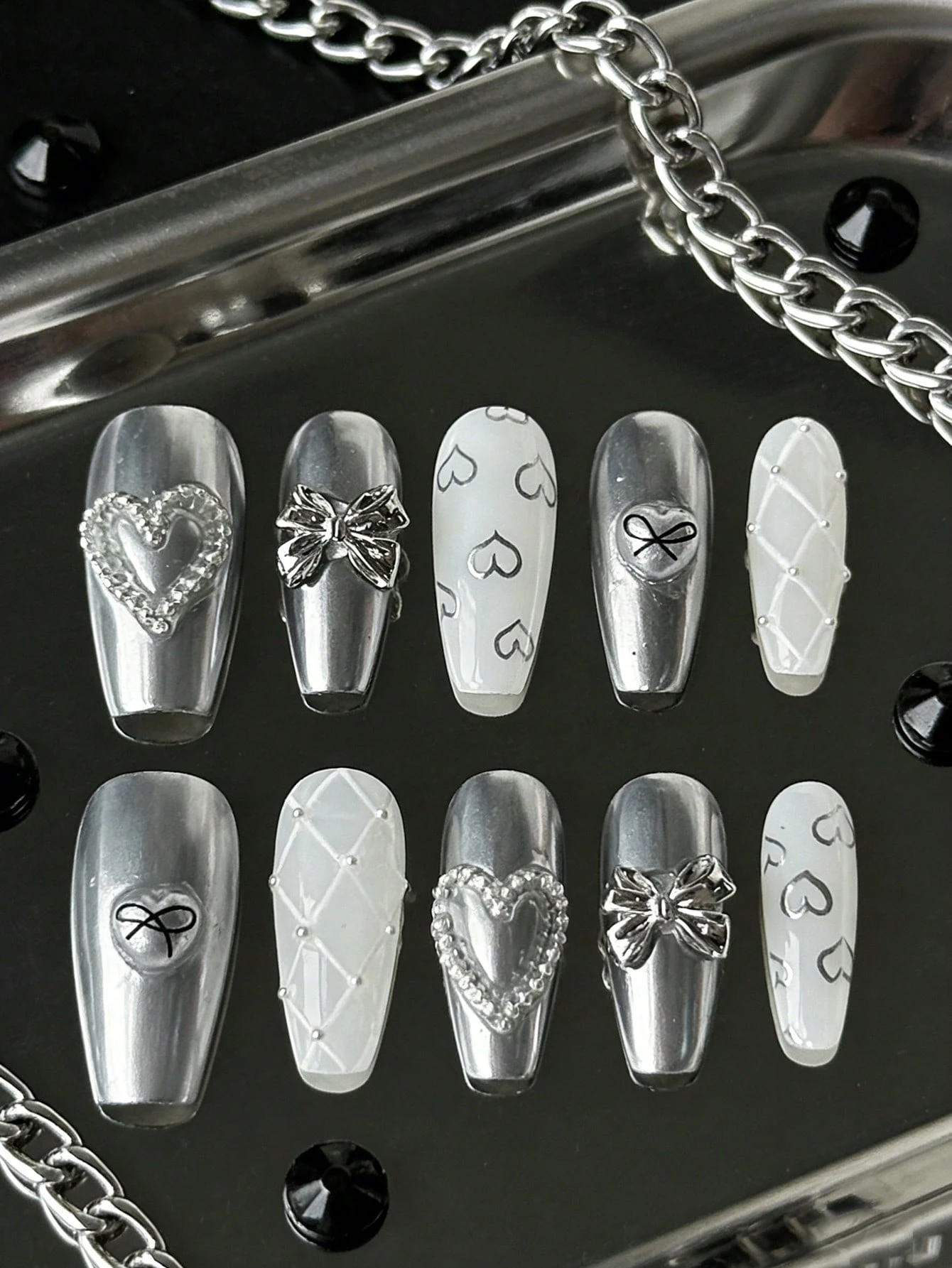 Kawaii 10 pezzi di unghie finte punk realizzate a mano + 3 pezzi di nastro biadesivo, unghie finte in metallo con elemento decorativo a fiocco in stile Y2K, di alta qualità, rimovibili e con foro, a forma di mandorla media, adatte per feste, balli e uso quotidiano.