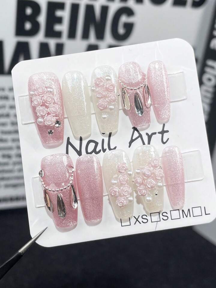 Kawaii Set Di 10 Unghie Finte Rimovibili Con Copertura Completa Stile Giardino Di Rose 3d