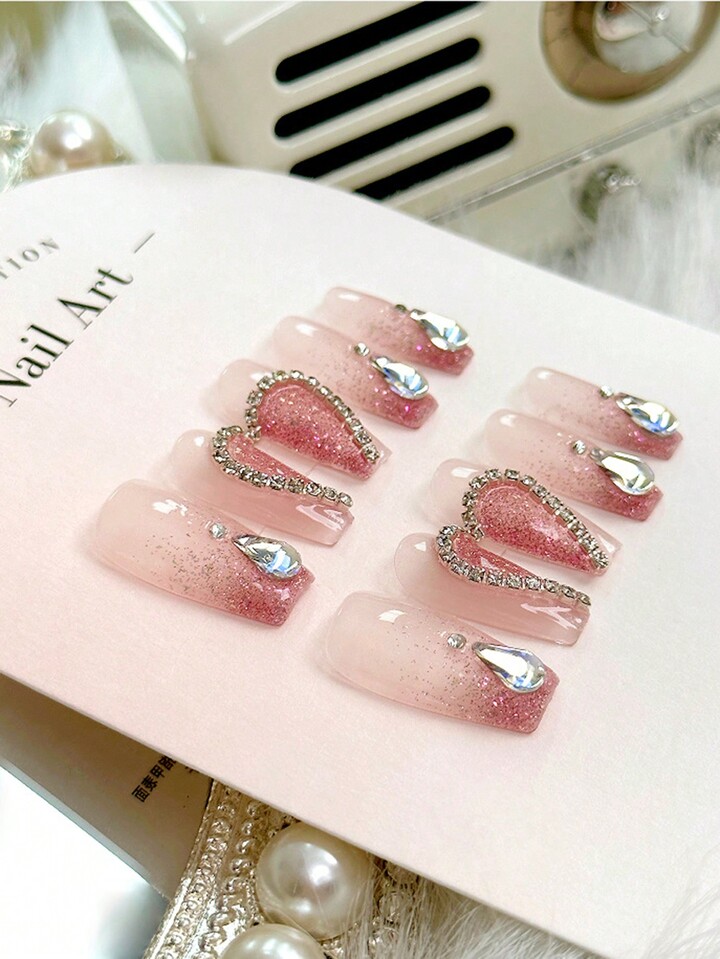 Kawaii 10 pezzi lungo bara con strass Unghie finte Kit