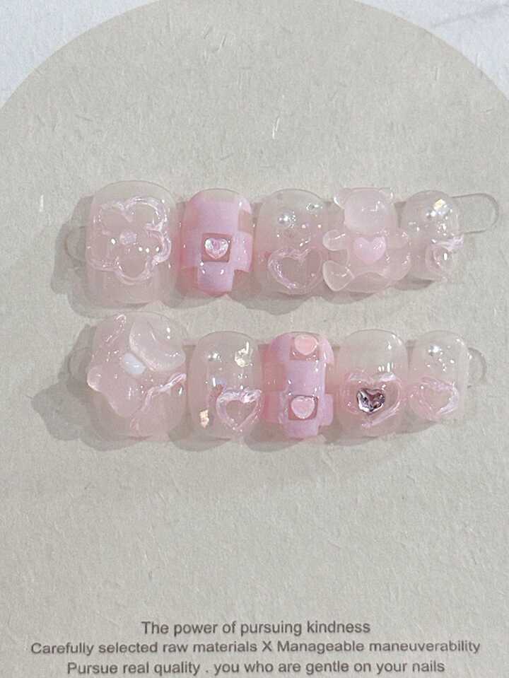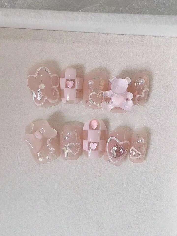 Kawaii 10 pezzi Unghie finte corto rotondo bolla design con orso di fumetto & modello a cuore , con Gelatina colla