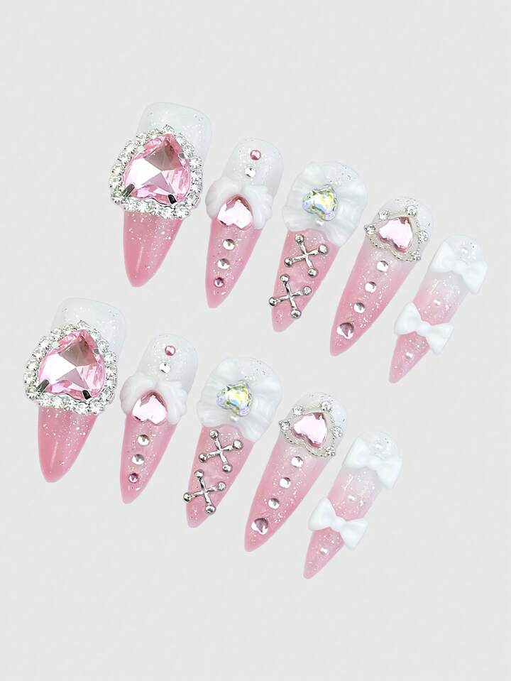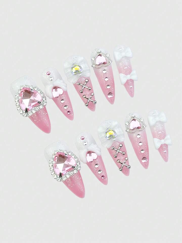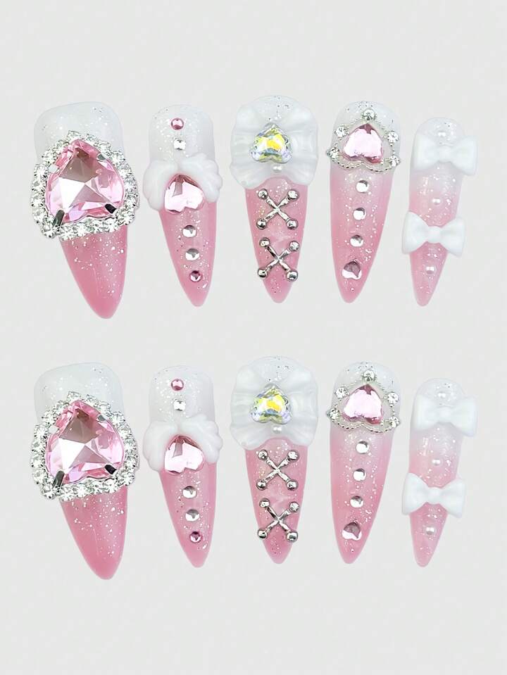 Kawaii 10 pezzi di unghie finte dolci e trasparenti a forma di cuore e fiocco con 1 pezzo di nastro adesivo