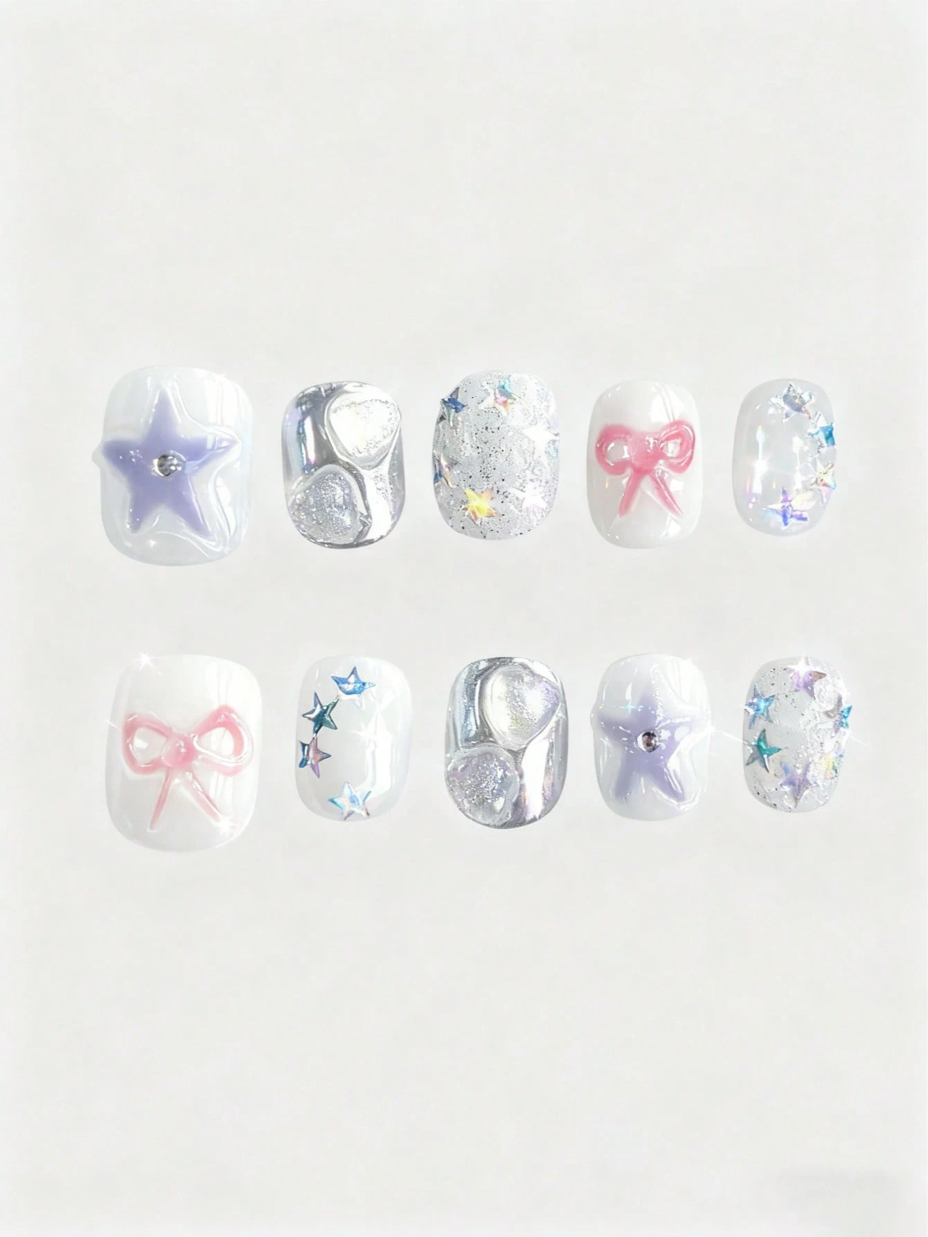 Kawaii 10 pezzi Unghie corte quadrate decorate con stelle e fiocchi, stile Y2K, colore argento lucido e nudo a quadri, con 3 pezzi di adesivo biadesivo
