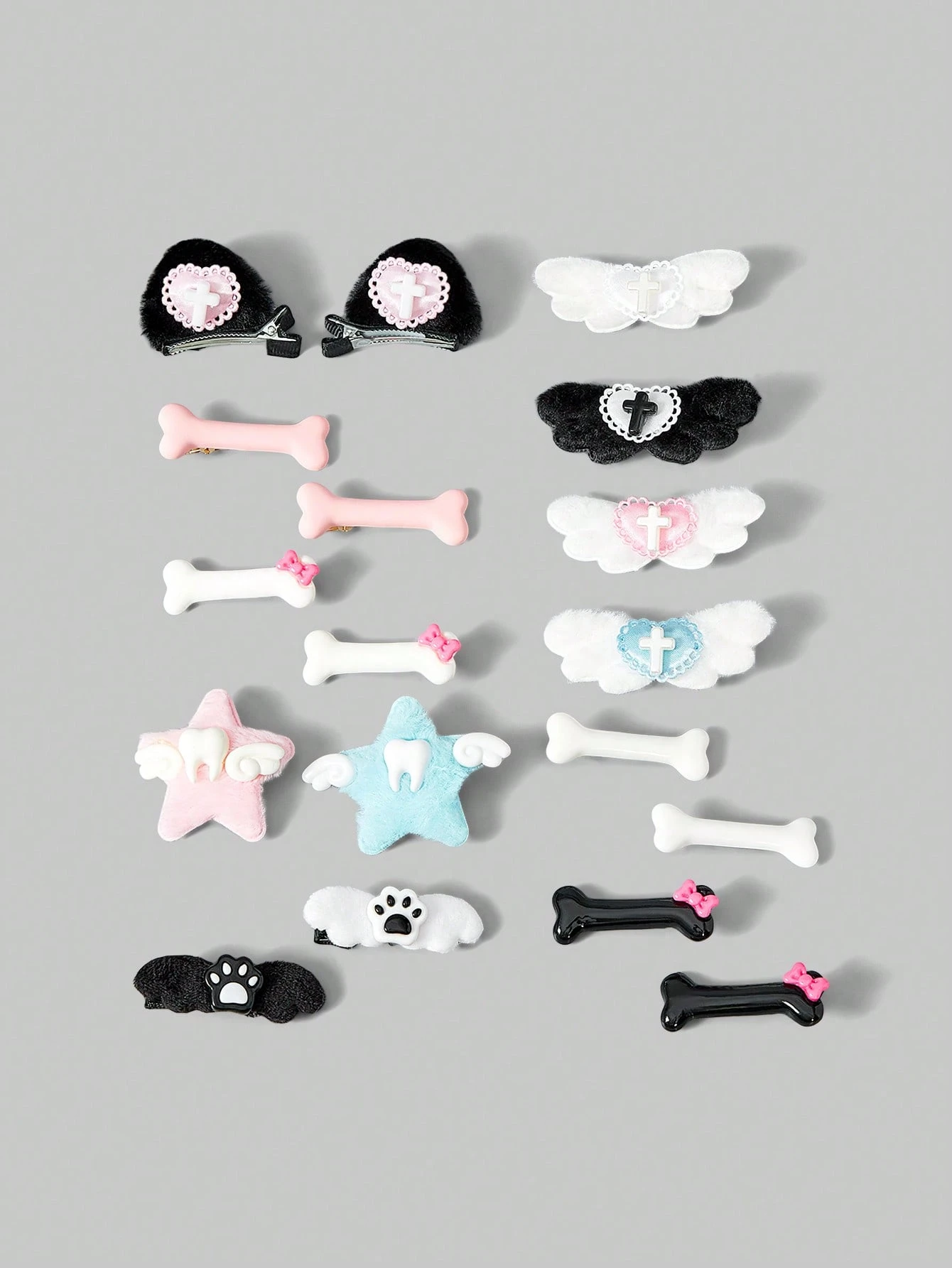 Kawaii 18 stili casuali, stile carino, fermagli per capelli colorati, ali fatte a mano, ossa, stelle, fiocchi, denti, croci, combinazione di elementi a forma di artiglio di gatto, fermagli per capelli piccoli, accessori per capelli in stile Lolita.