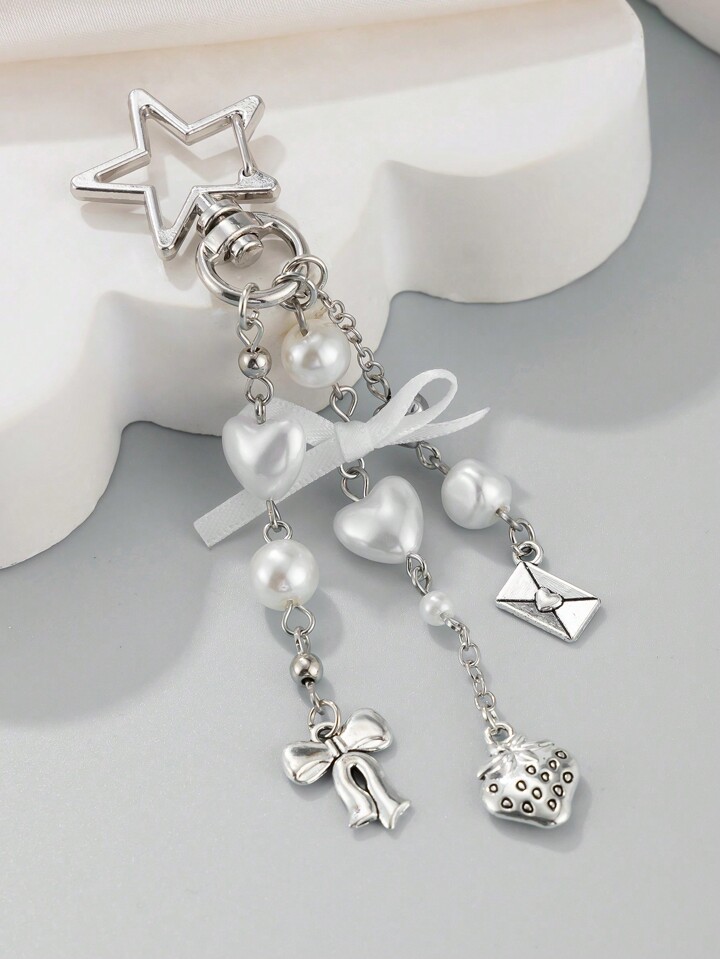 Kawaii 1 pezzo Ciondolo portachiavi con fiocco a forma di fragola, perle finte e nappine, adatto per borse, telefoni, regalo per amici e coppie per San Valentino