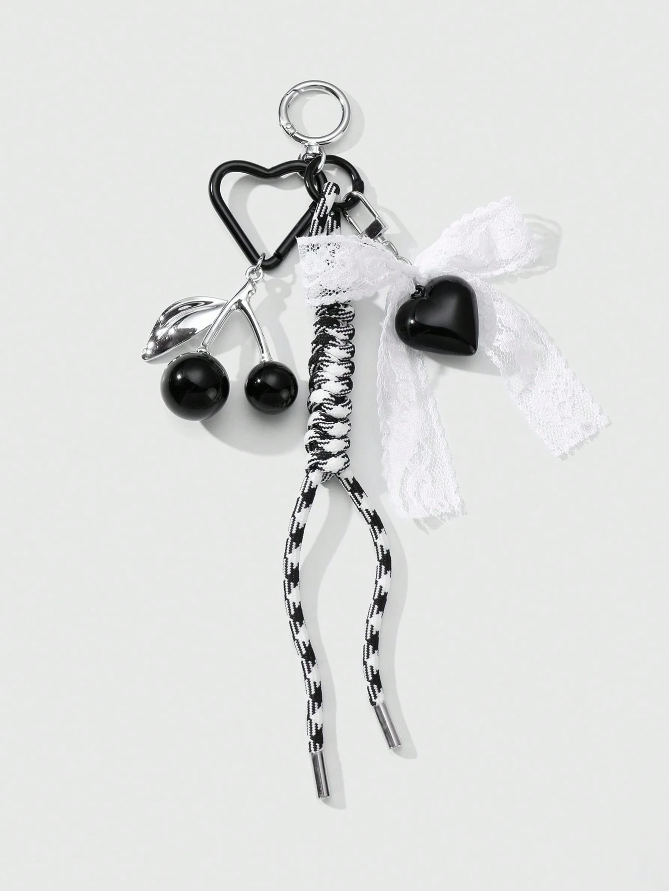 Kawaii 1 pezzo Ciondolo chiave, charm per telefono, decorazione per borse, in stile gotico delicato, con cuore in resina nera, fiocco bianco in rete, cordino intrecciato in acrilico, adatto per donne, ragazze, uso quotidiano o regali